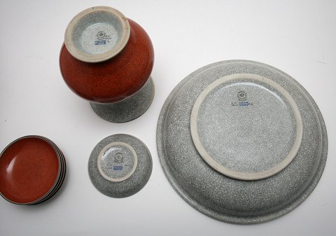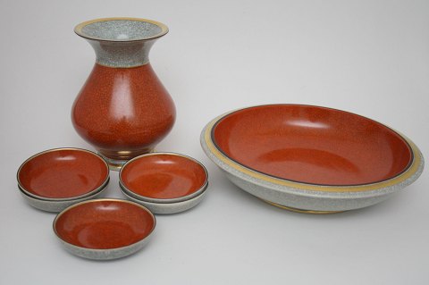 Royal Copenhagen, krakelé i orange og grå med guldkanter.
