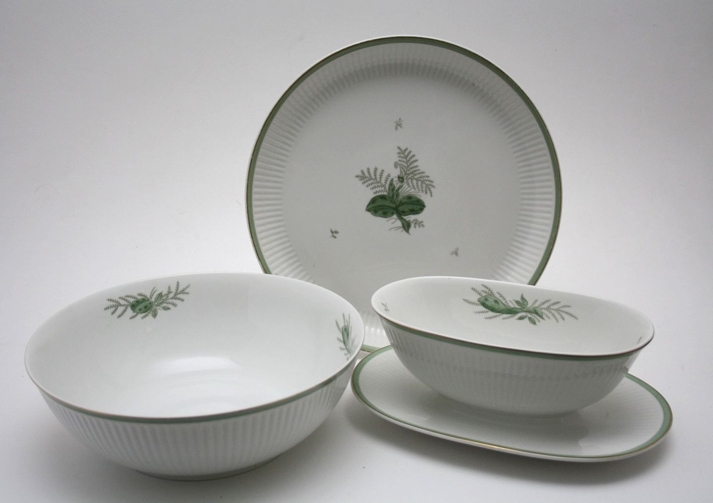 Royal Copenhagen, Grøn Melodi designet af Thorkild Olsen i 1950'erne. Hvidt riflet stel med guldkant og motiver i grønt. Dekorationsnr. 1513. I. sortering.