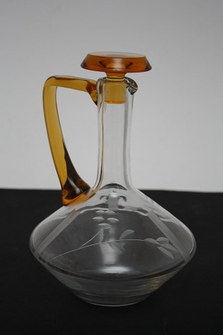Likørkaraffel med ravfarvet prop og hank antagelig svensk. Højde 20,5 cm. Midterste diameter 14 cm. Flot stand. Pris: 275 kr.