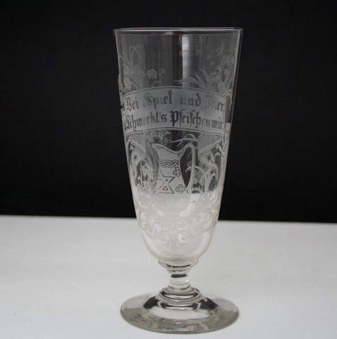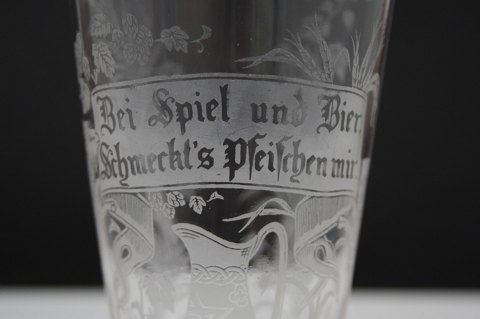 Tysk glas med inskription: Bei Spiel und Bier Schmeckt´s pfeifchen mir. Motiv med blomsterranker, 2 dyr på bagben og en kande med Davidsstjerne. Højde 16,6 cm. Øverste diameter 7,5 cm. Pris: SOLGT