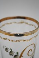 Fyens Glasværk, Vandglas med guldbelagt rand, samt emaljemalet stort "C" med liljekonvaller og bort under randen. Fremstillet i 1903. Lille afslag i guldkanten. Højde: 11,8 cm. Diameter: 6,8 cm. Pris: