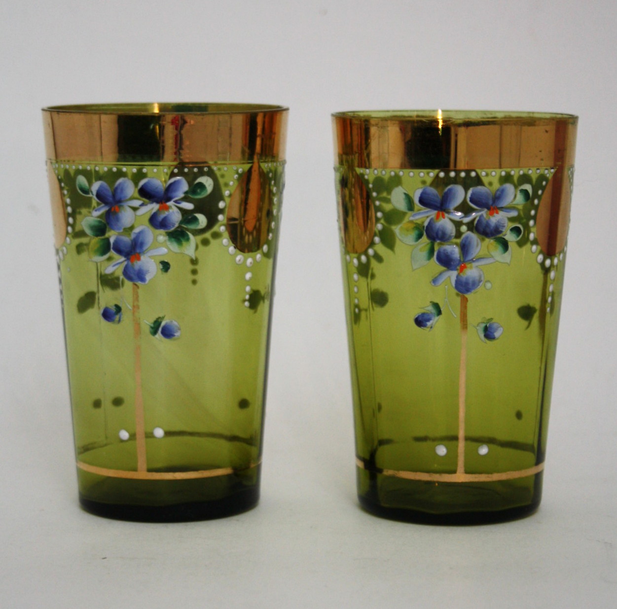 Emalje bemalede tyske vandglas med bred guldkant. Der er lidt brugsslid på guldkanten. Højde 11,5 cm. Øverste diameter 7 cm. Pris: 175 kr. Lager: 1