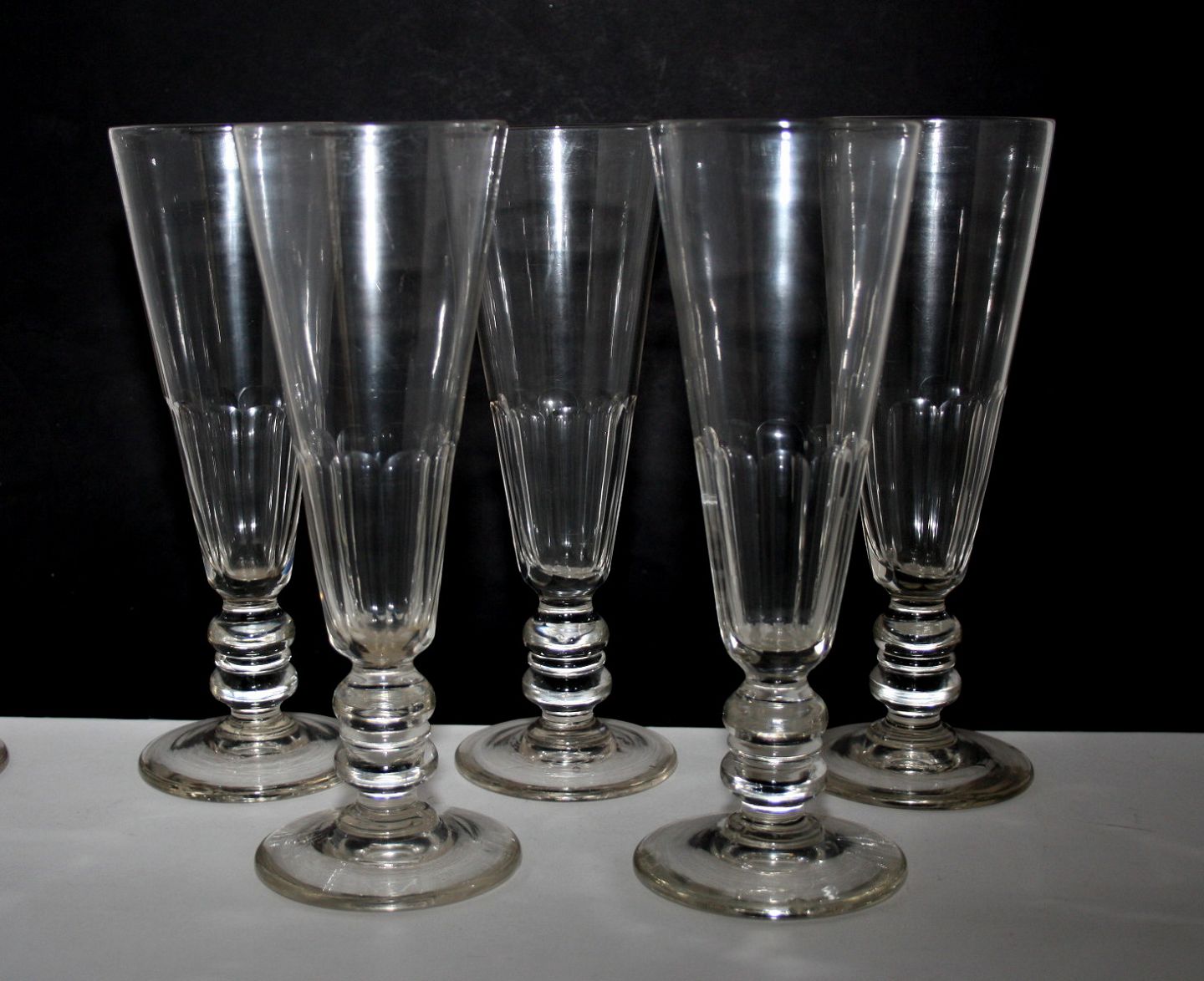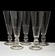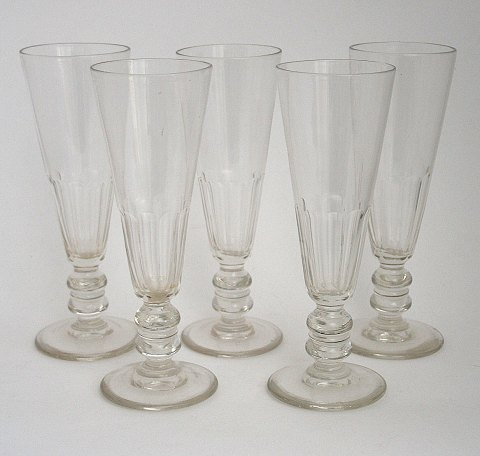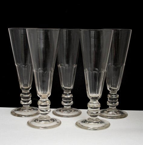 Holmegaard Toupie porterfløjter fra starten af 1900 tallet. Fransk inspireret. Halv facetslibning nederst på kummen. Rundslebet i bund. Højde 23,8 cm. Øverste diameter 8,5 cm. Brugsslid, men ingen skår. 5 stk. sælges samlet pris: SOLGT