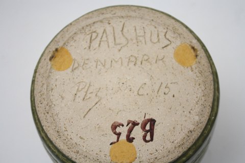 Palshus keramik. Grøn vase. Fra 1960-70érne i flot stand. Grøn glaseret chamotte stentøj. Højde 18,5 cm. Diameter 14,5 cm. Signeret PL-S. Per Linnemann-Schmidt. Formnr. C 15 B25. Pris: SOLGT