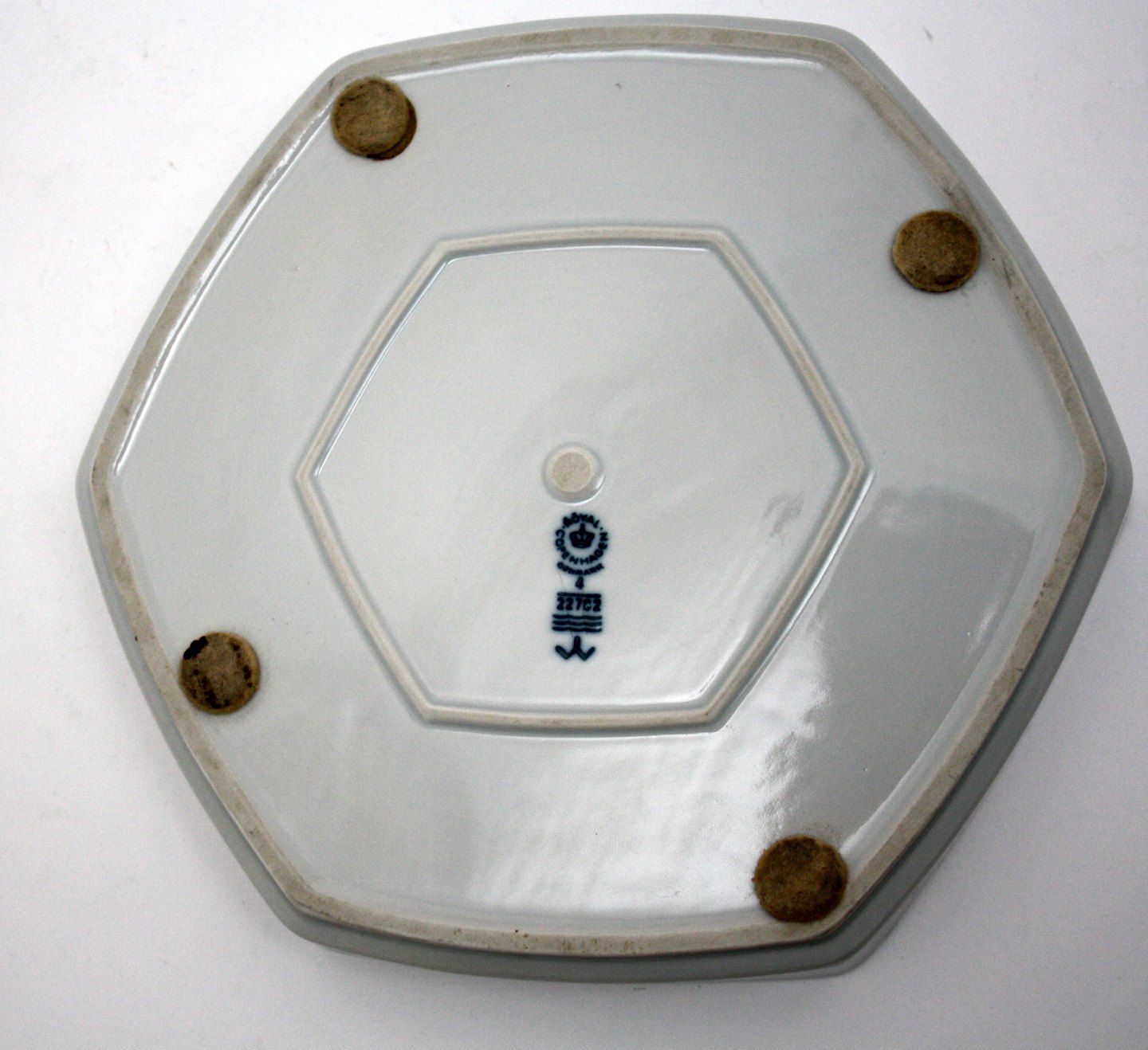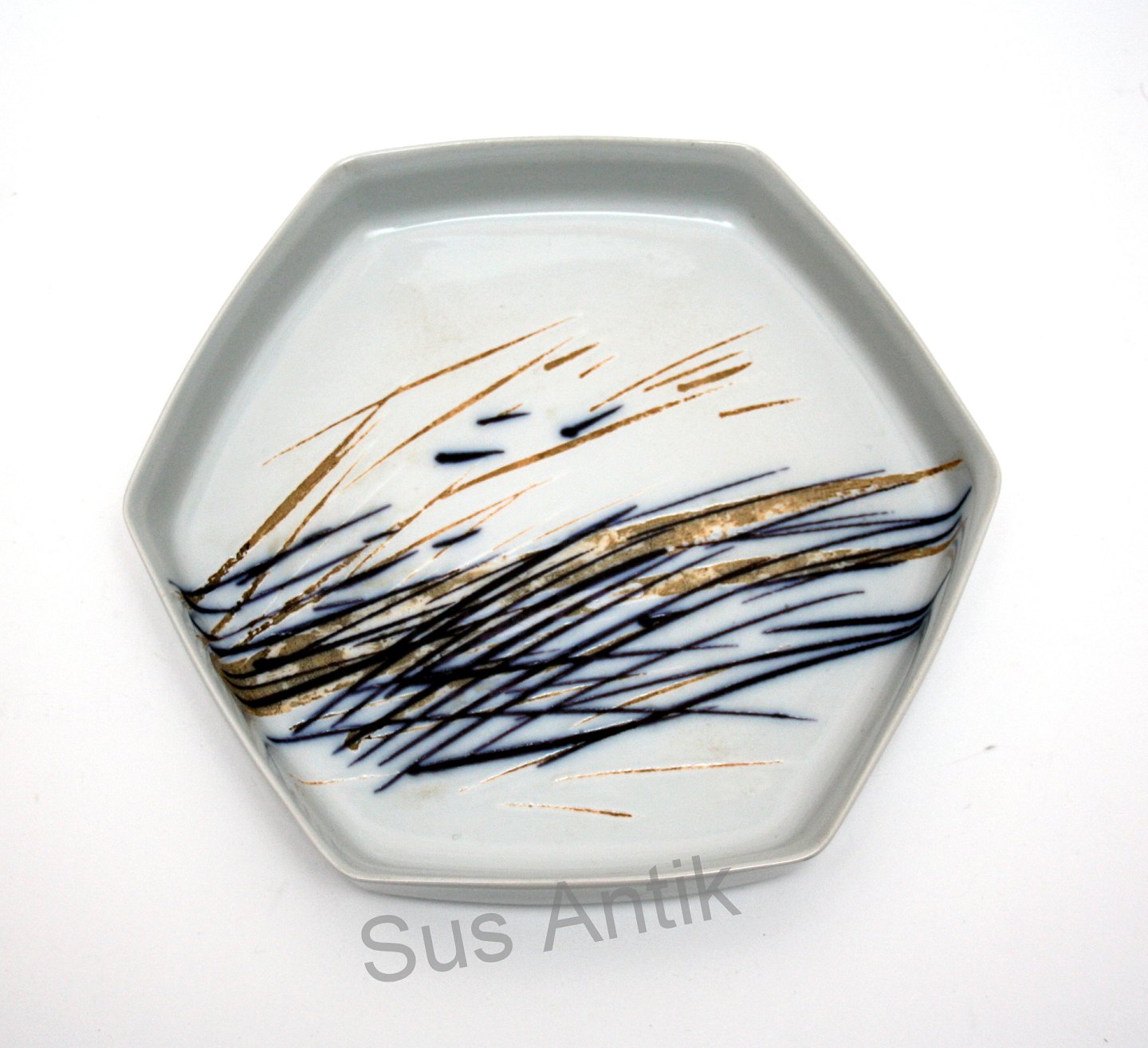 Sekskantet fad. 22782. III. sortering. Højde 3 cm. 19,5 x19,5 cm. Pris: 350 kr.
