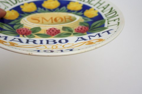 Aluminia, Mejeriplatte, Anerkendelse for velbehandlet smør. Maribo Amt 1917. Stemplet Kjøbenhavns Fajancefabrik Danmark. Luftmalet dekoration efter tegning af Oscar Willerup.