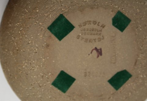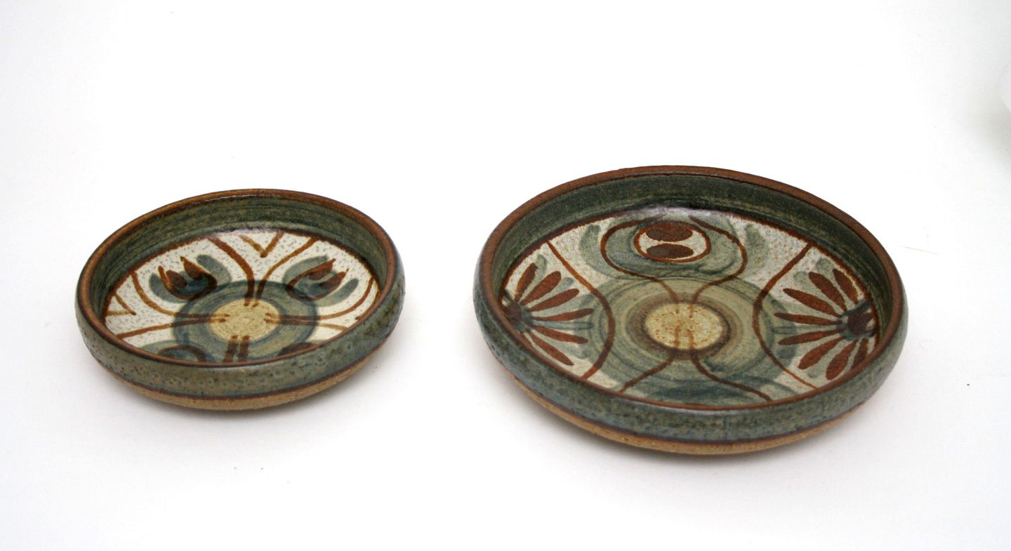 Søholm, Runde/skåle i chamotte stentøj med brun og grøn glasur fra 1970'erne. Tv. fad/skål. Nr. 3210/3. Diameter 14 cm. Højde 3,5 cm. Pris: SOLGT Th. fad/skål. Nr. 3218/4. Diameter 18 cm. Højde 4 cm. Pris: SOLGT