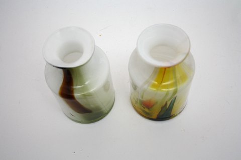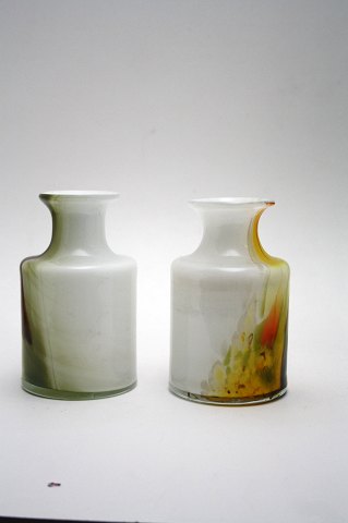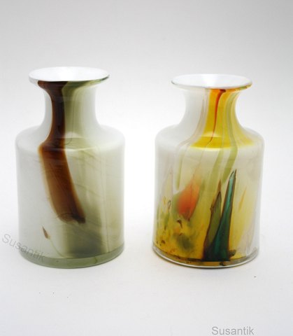 Holmegaard, Cascade vaser designet af Per Lütken i 1970. Mundblæst opalhvid glas med indlagte skår i forskellige farver. Højde 15 cm. Diameter 9 cm. Gul. Signeret HG 4, PL. (1974). Pris: Brun. Signeret HG 7, PL. (1977). Pris: