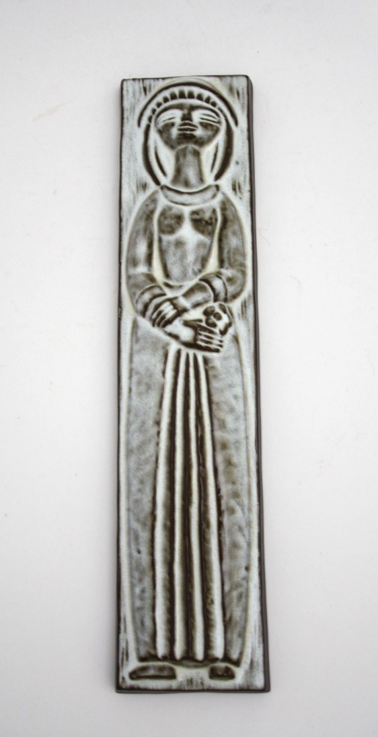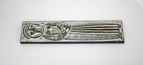 Michael Andersen, Hvid glaseret relief med kvinde designet af Marianne Starck. Form nr. 5843. Længde 35 cm. Bredde 8 cm. Pris: SOLGT
