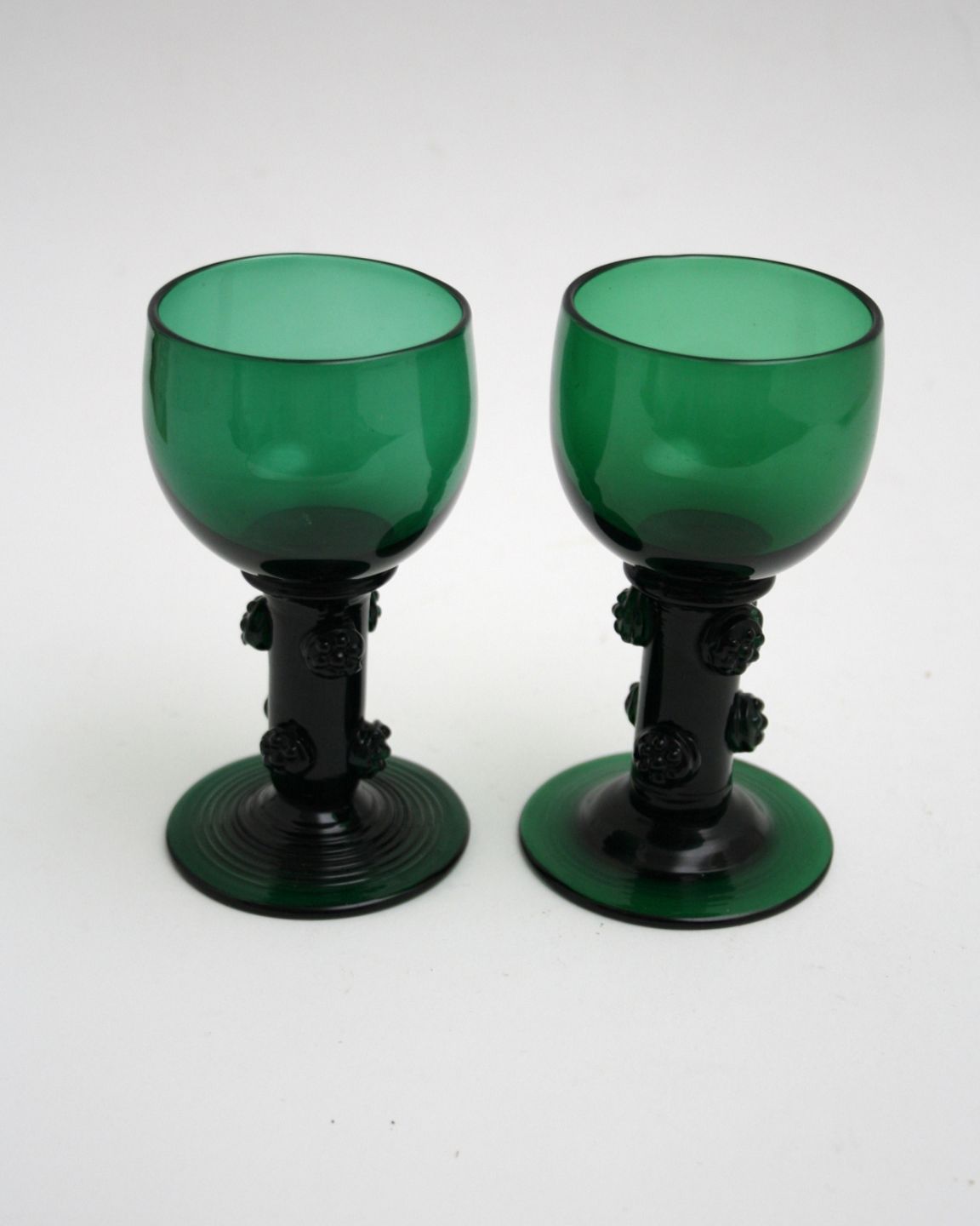 Rømerglas i ædelgrøn farve. Rossetter på stilken. Holmegaard 1875 Højde: 12 cm. Øverste diameter 6 cm. Pris: SOLGT