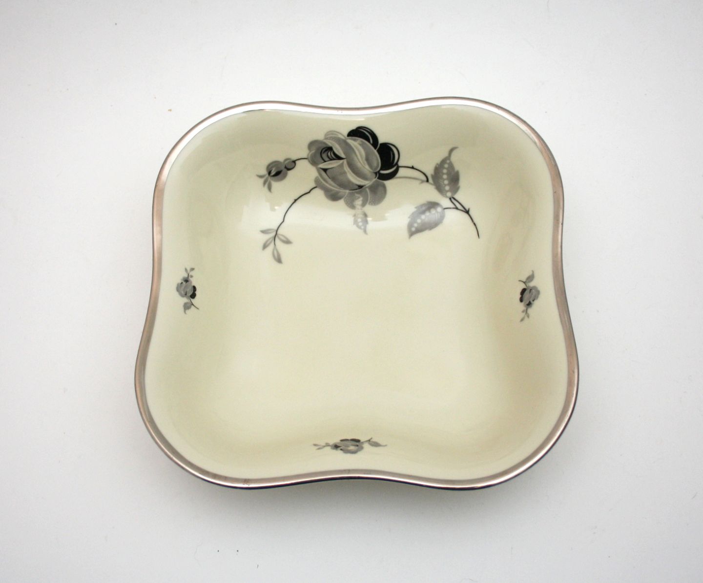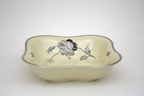 Kjøbenhavns Porcellains maleri, Sort rose creme med platinkant. Kartoffelskål. Højde 6,5 cm. 23 x 23 cm. Pris: SOLGT