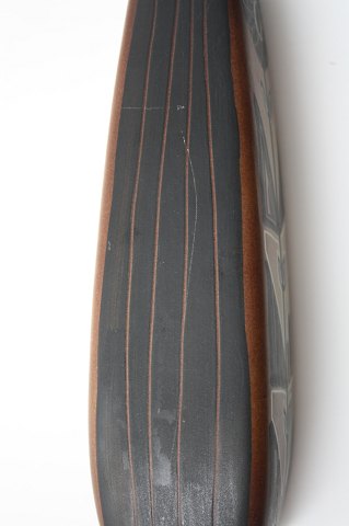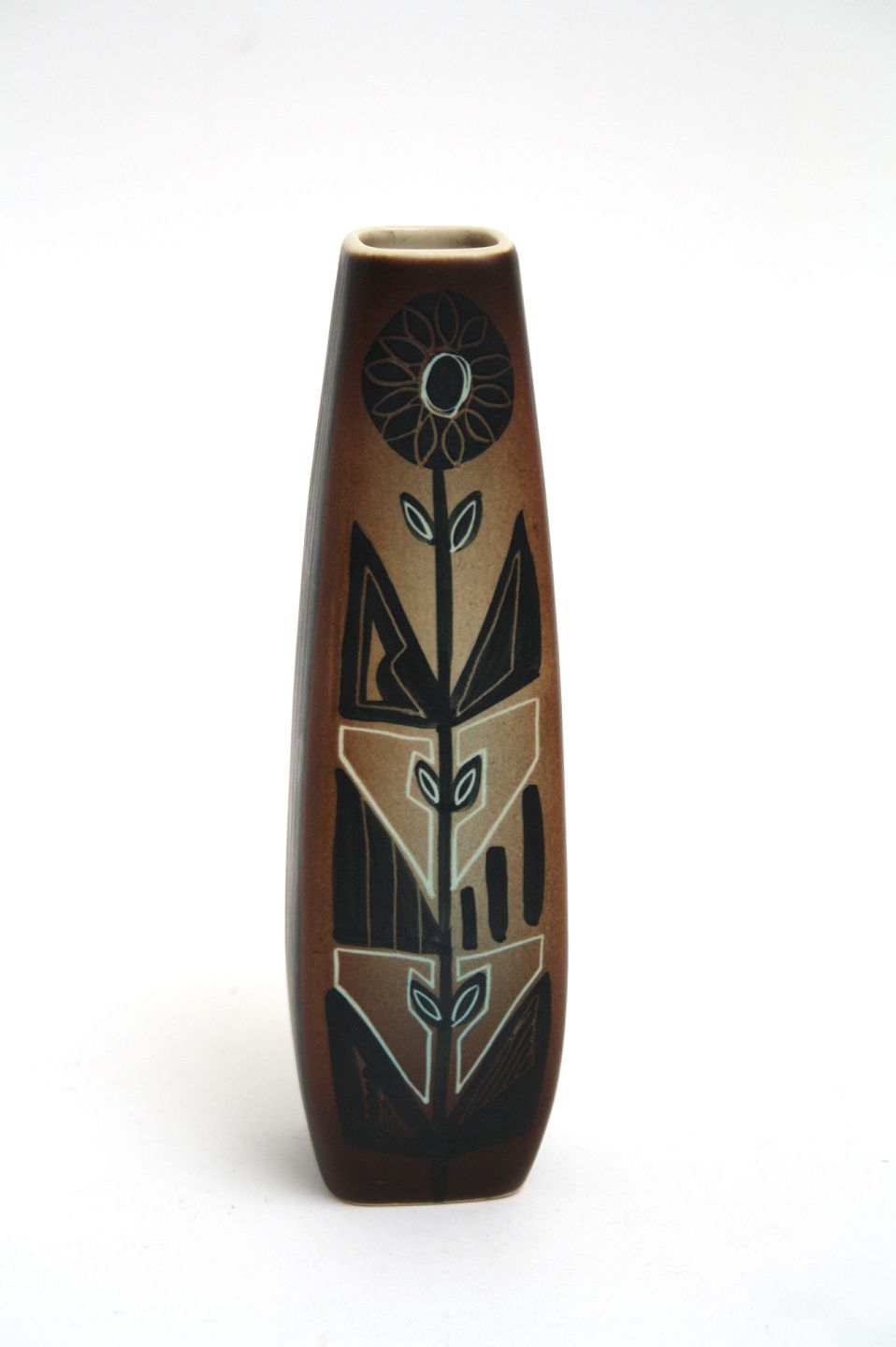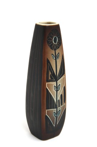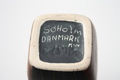 Søholm vase i brunlige farver med striber på 2 af siderne og blomstermotiv på de andre 2. Højde 21,5 Øverste diameter 3,5x3,5 cm. Nederste diameter 4,5 x4,5 cm. Overfladeridse på siden se ekstra foto. Pris: SOLGT