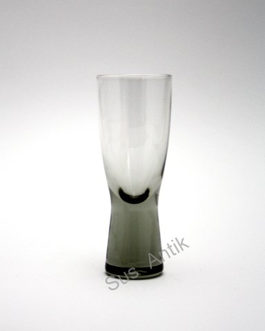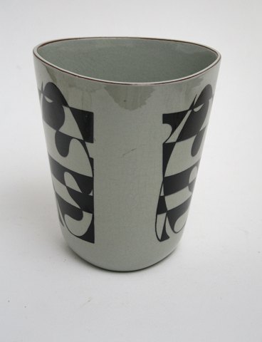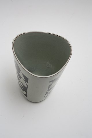 Knabstrup, grå trekantet vase med sorte motiver. Overfladekrakeleringer. Højde 15 cm. Øverste diameter 13,5 x 13,5 cm. Pris: SOLGT
