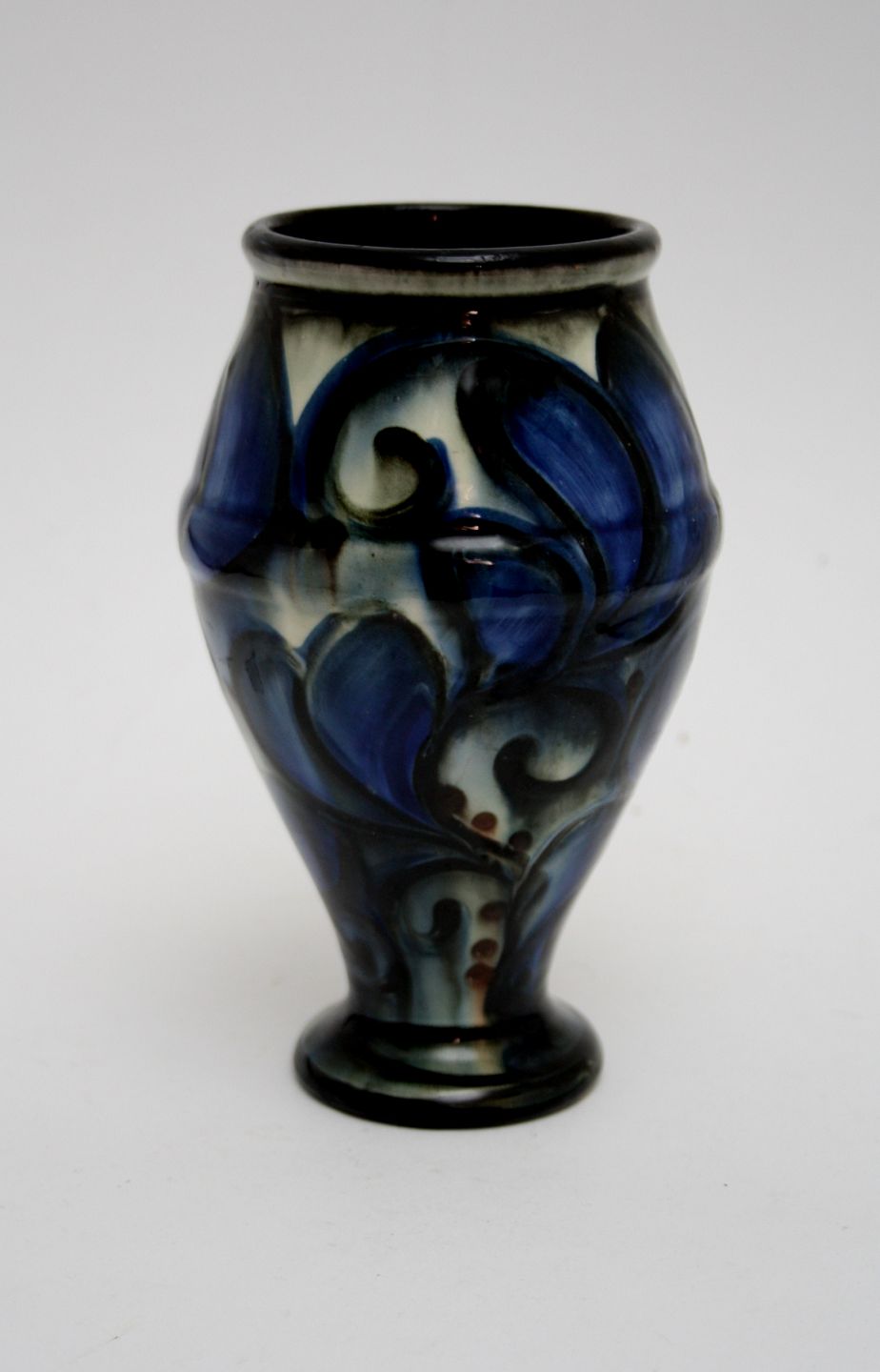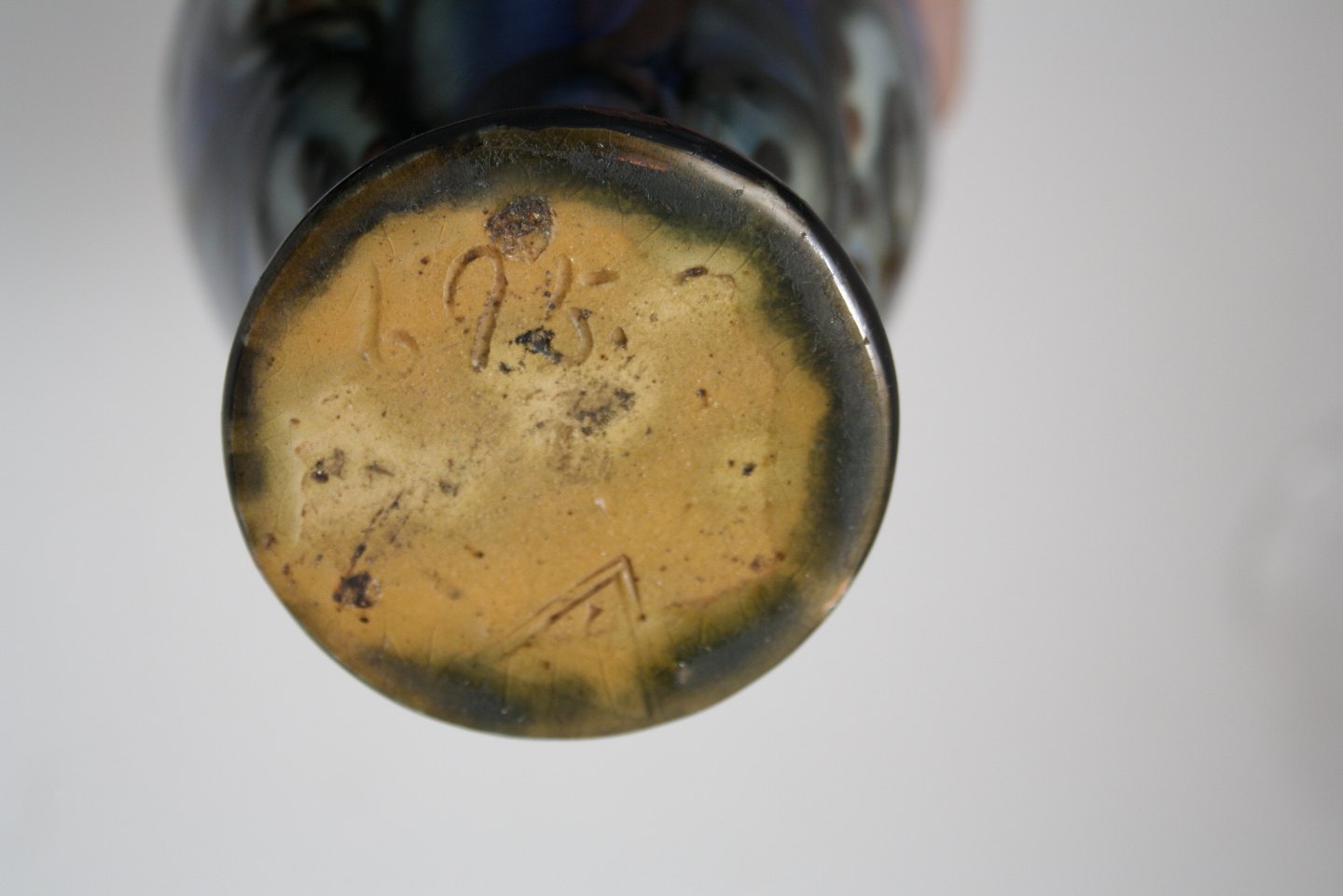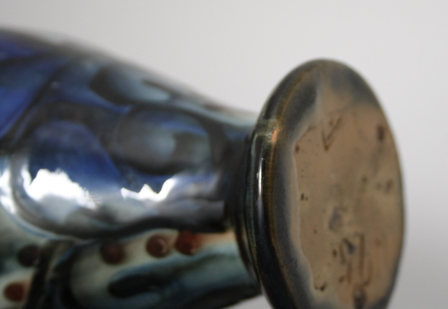 Vase i korhornsglasur. Formnr. 675. I bund en trykt trekant. Højde 18 cm. Øverste diameter 8 cm. Lille afslag i bund, se ekstra foto. Pris: SOLGT
