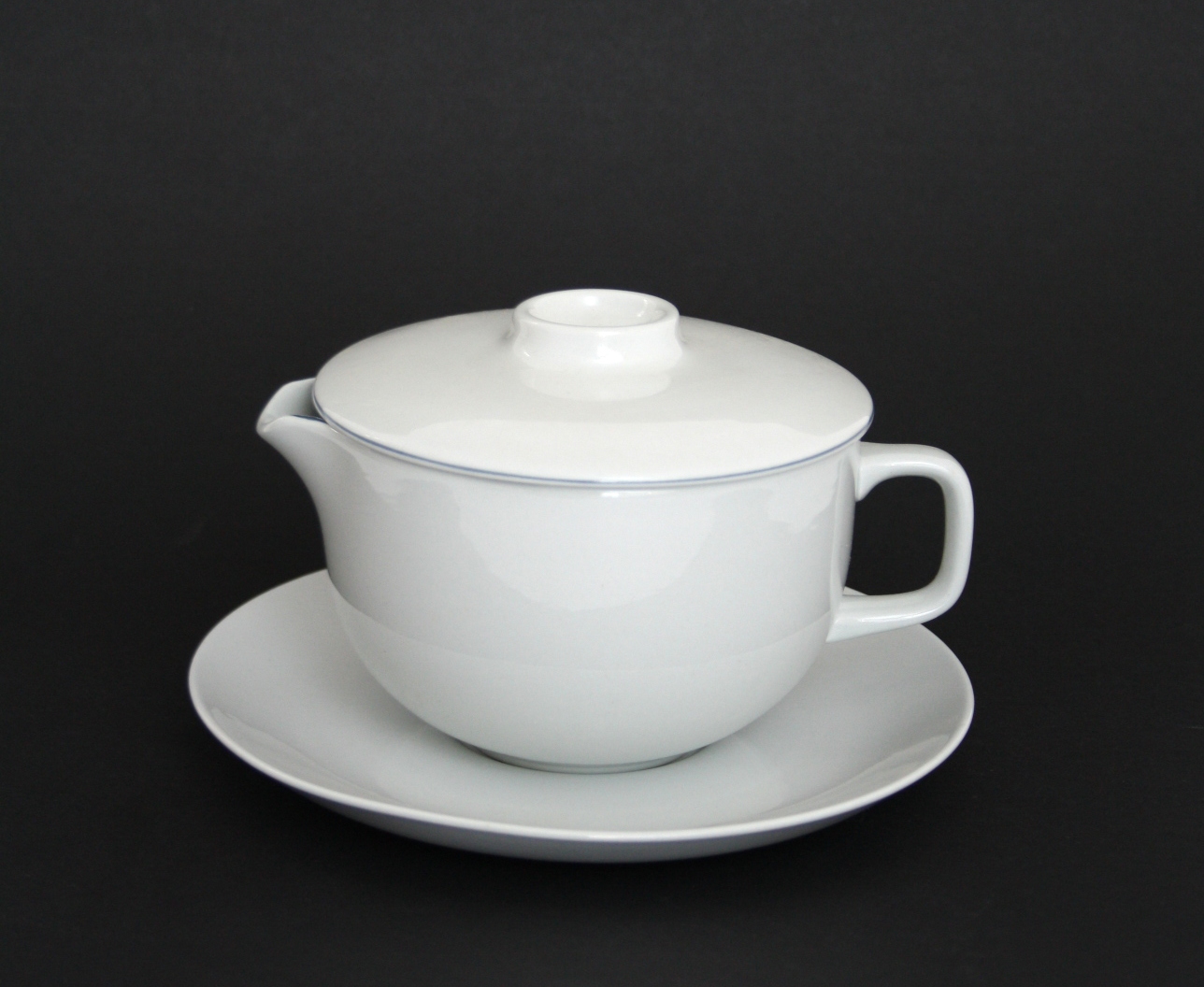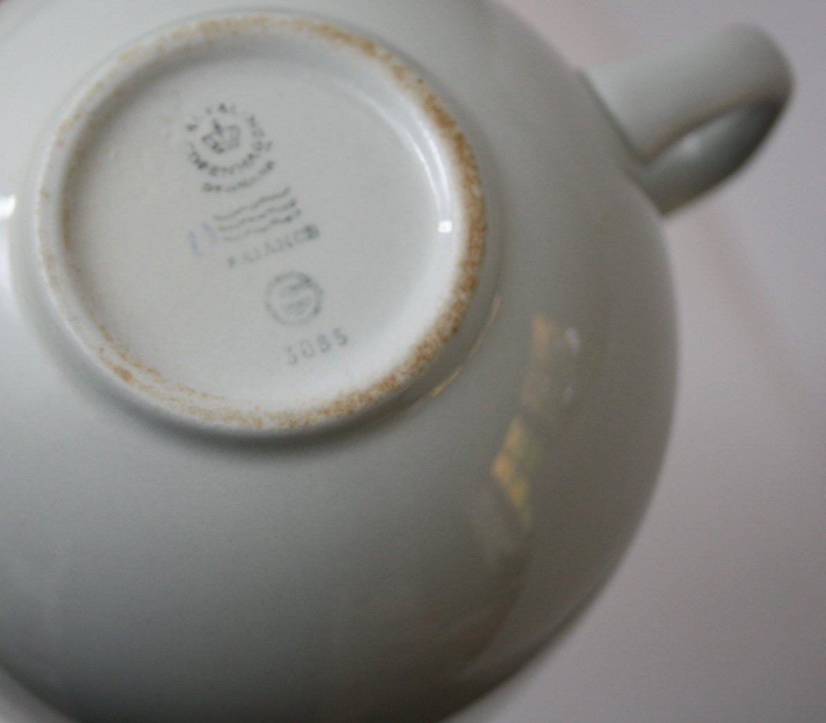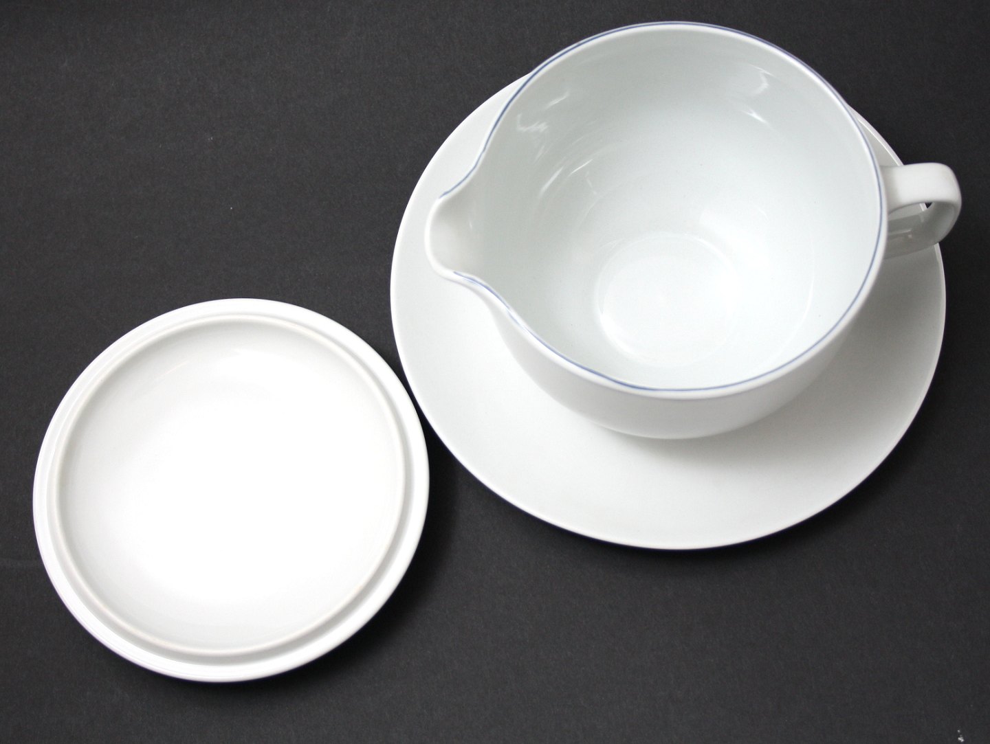 Royal Copenhagen fajance, Blåkant. Designet af Grethe Meyer i 1965. Sovsekande med underkop og låg. Nr. 3085. Højde med låg 10,5 cm. Diameter 11,5 cm. II. sortering. Fin stand. Pris: SOLGT
