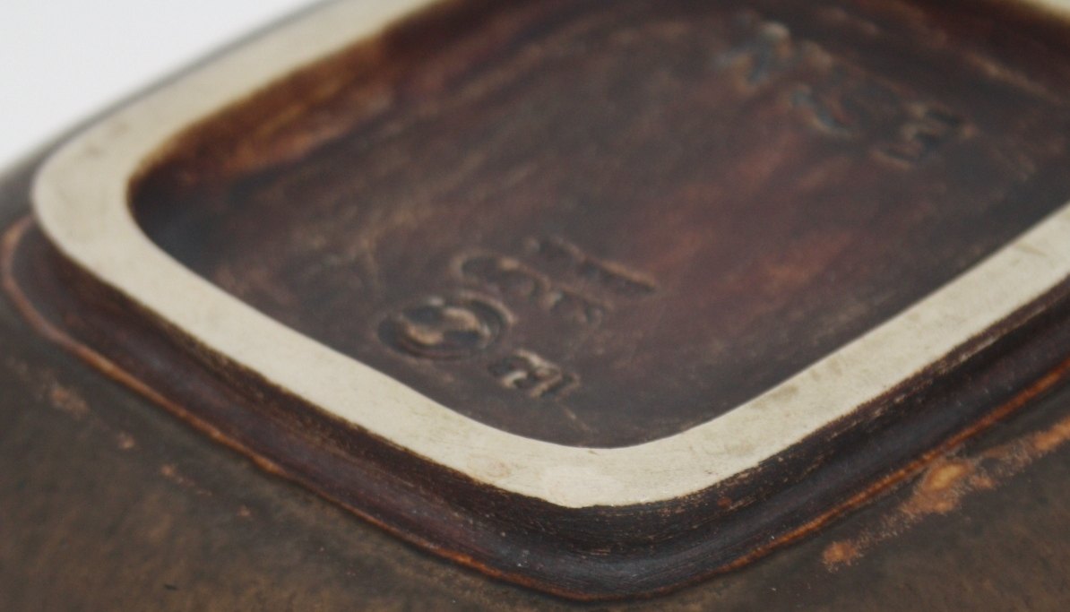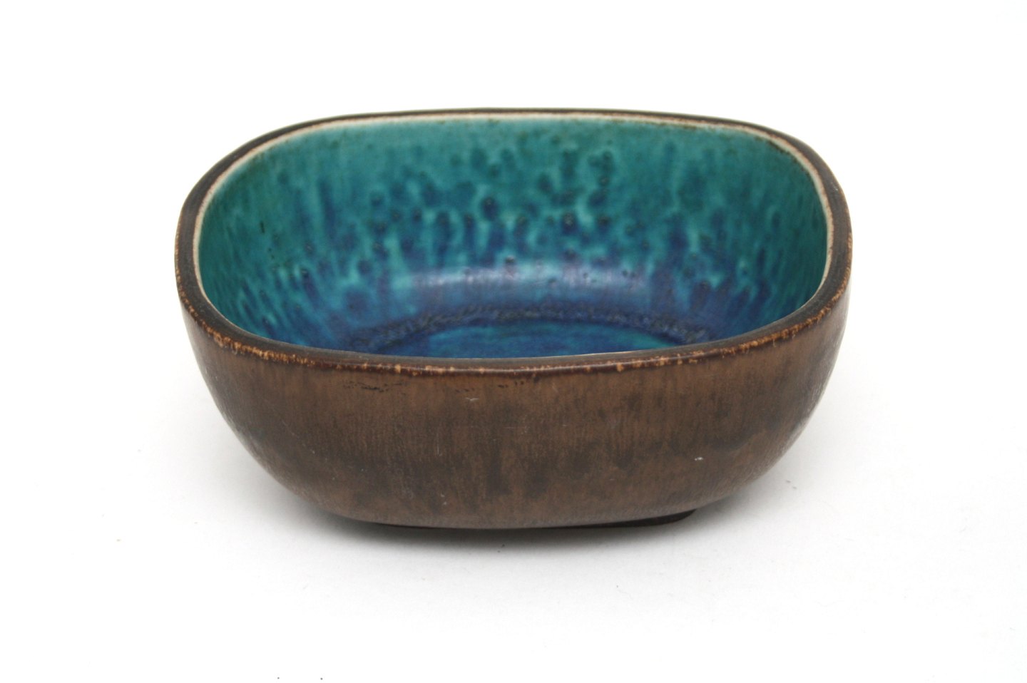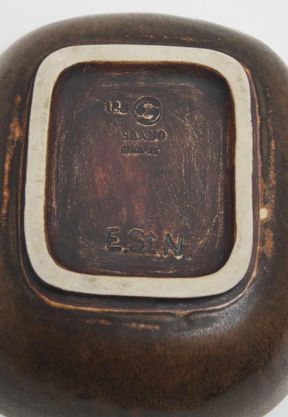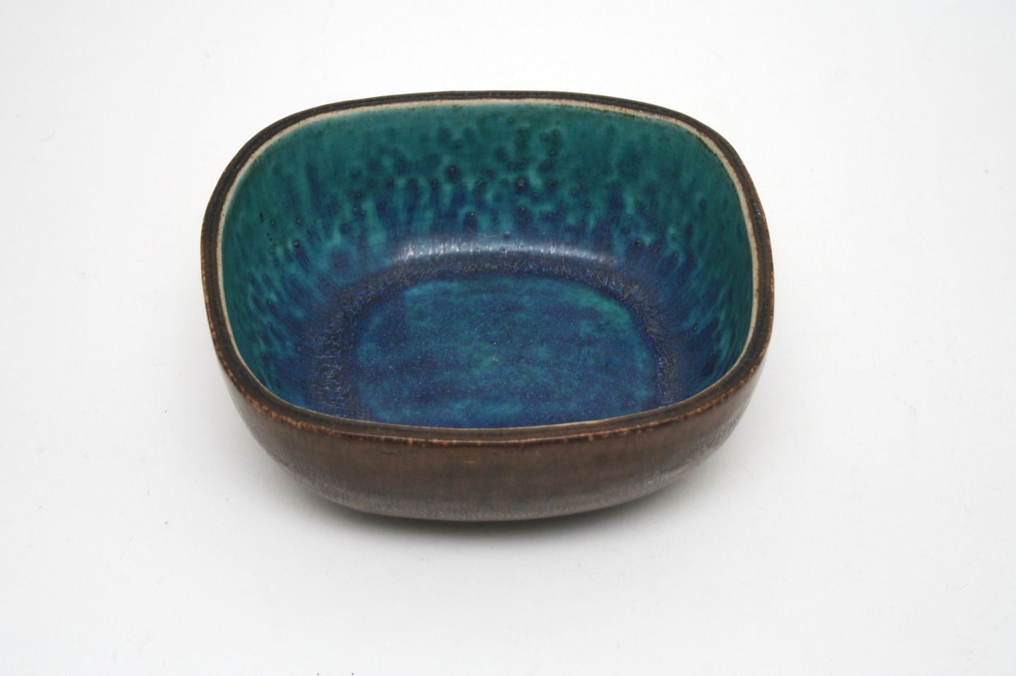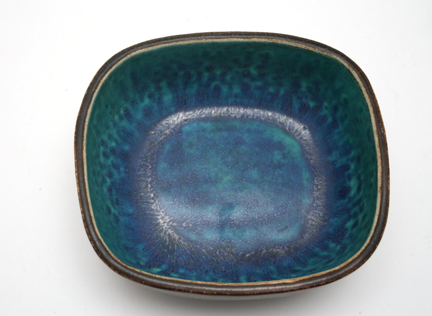 Saxbo keramik, skål designet af Eva Stæhr Nielsen. Glasur i blå/grønne farver, billedet snyder lidt, den er mere grøn end blå. Harepelsglasur udvendig. Form.nr. 188. Stemplet E.St.N. Mål: 16 x 18 cm. Højde 7,5 cm. Der er et afslag i bunden, se ekstra foto. Pris: SOLGT