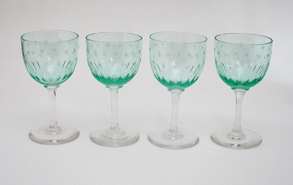 Holmegaard, Chr. 9. Krystal Hvidvin i sart grøn. Rundbuet kumme, høj spinkel stilk og flad fod. Kummen er slebet med 2 rækker stjerner og rund nederst oliveslibning. Er i Holmegaards katalog fra 1917. Højde 12 cm. Diameter 6 cm. Pris: SOLGT