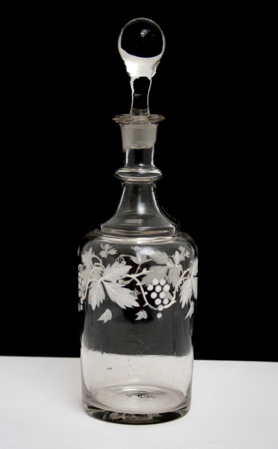 Karaffel med hvid emaljebemalet vinranke. Sorte pletter i bemalingen. Knækket i bund. Højde 23,5 cm. Pris: SOLGT
