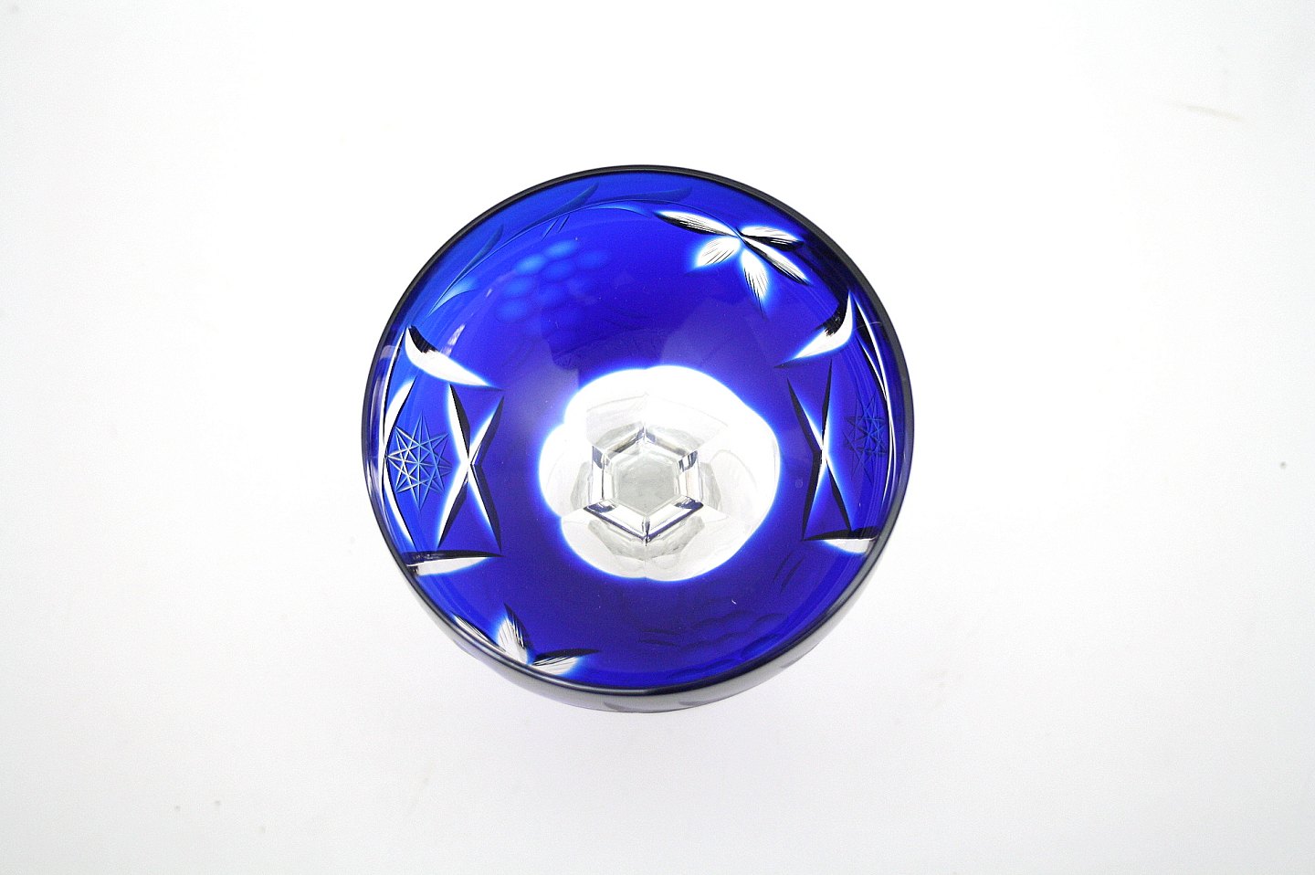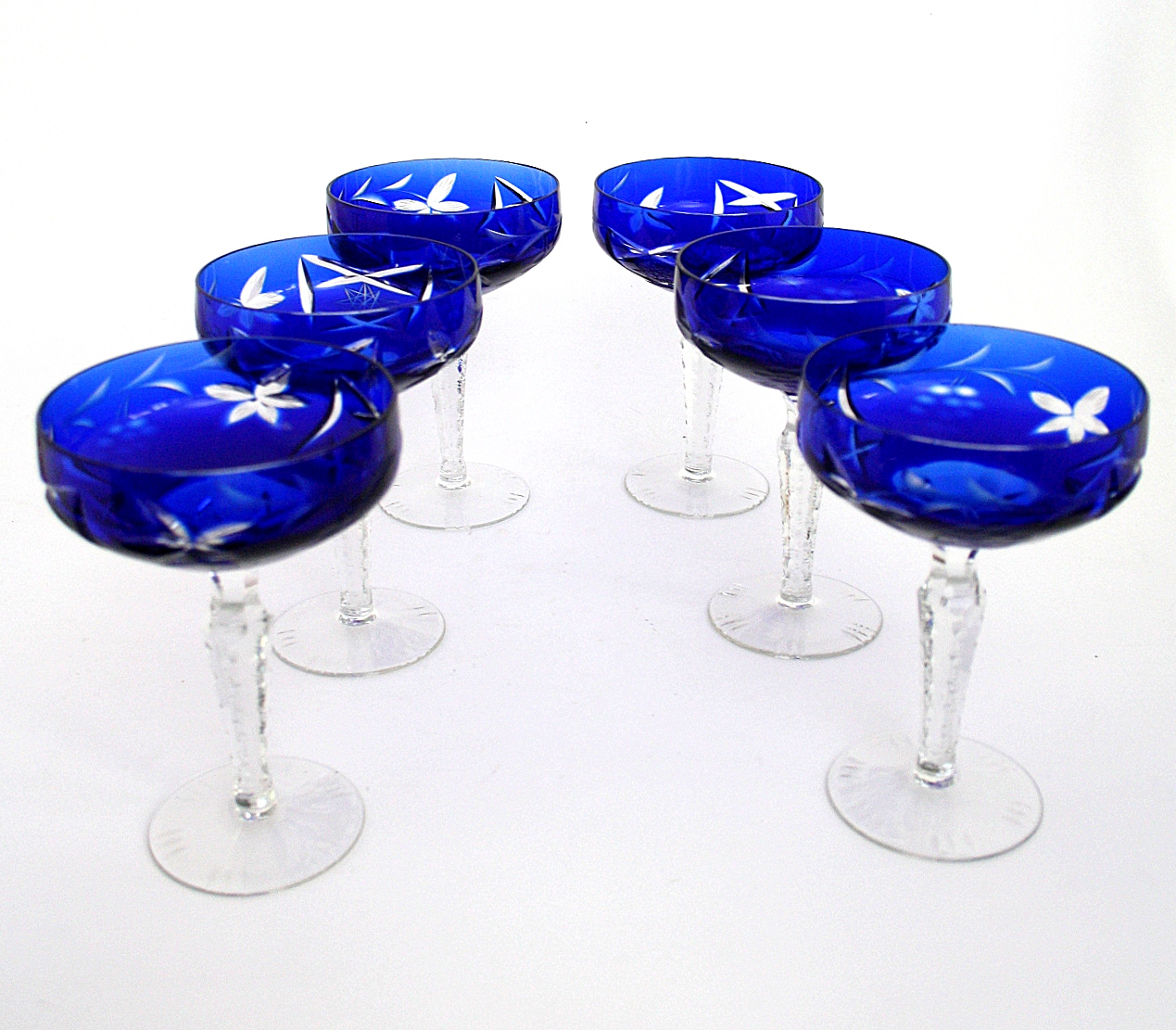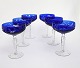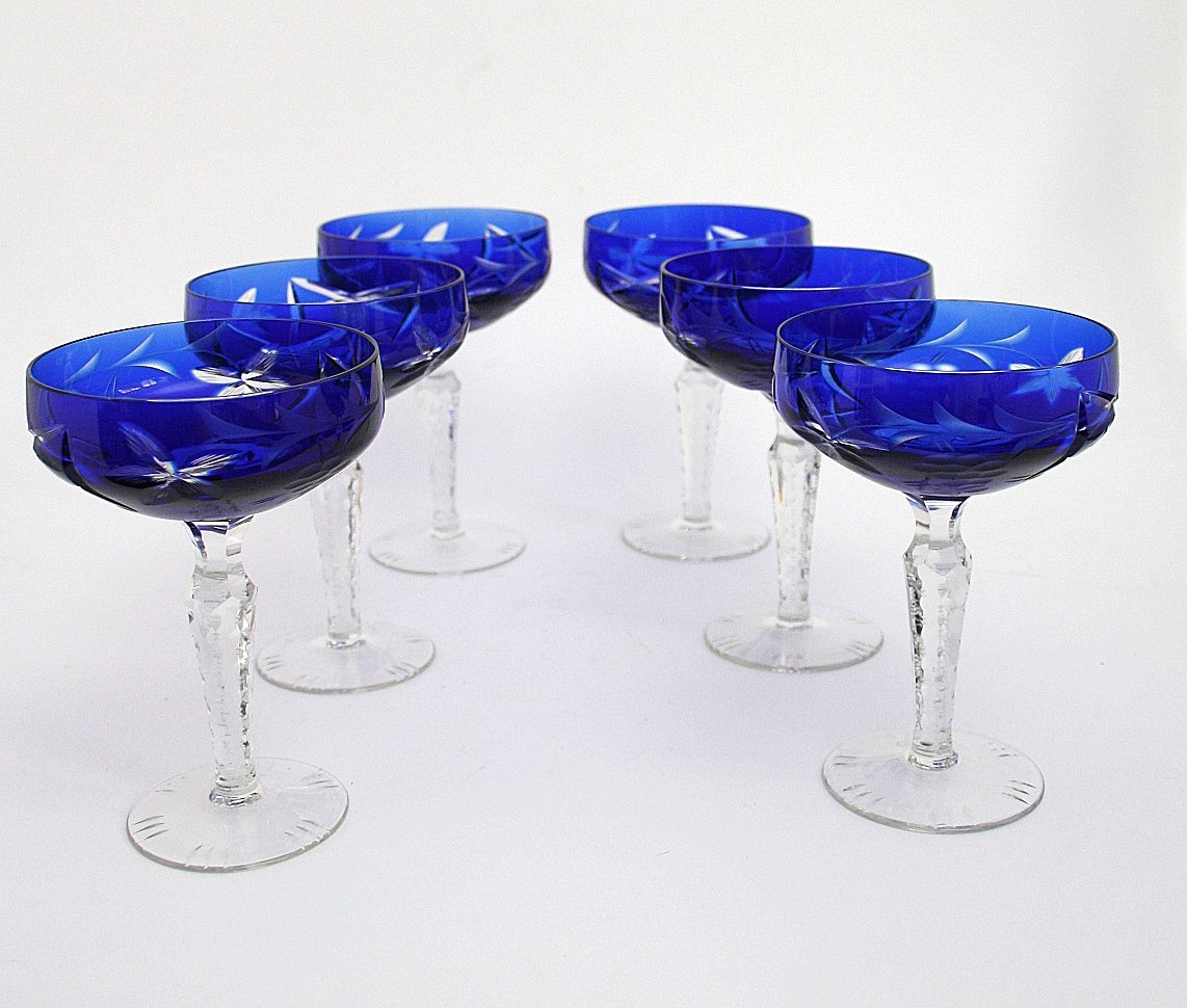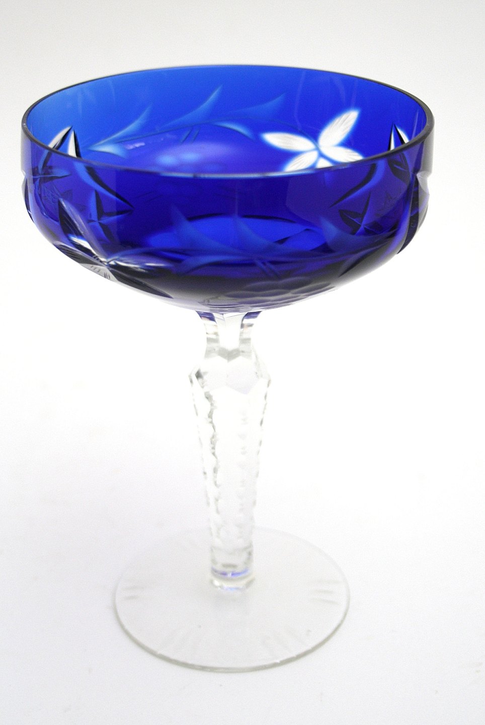 Bøhmisk krystal, blå champagneglas, slibninger på kumme, stilk og fod. Højde 15 cm. Diameter 10 cm. Pris: SOLGT