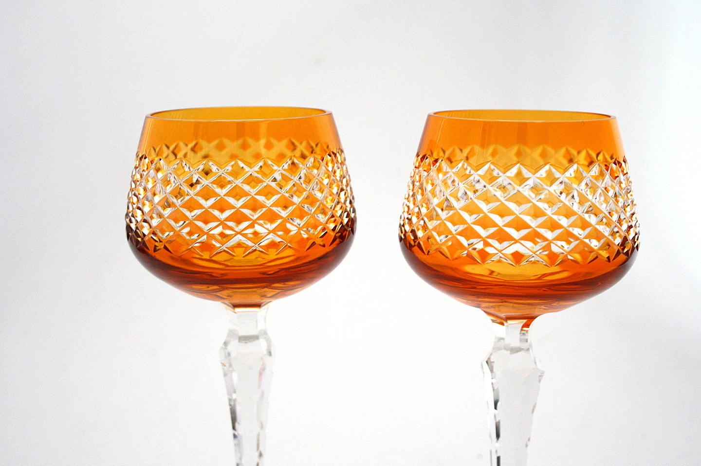 Bøhmisk krystal, vinglas med slibninger på kumme og stilk. Højde 20 cm. Pris: 225 kr. stk. Orange. Lager: 2