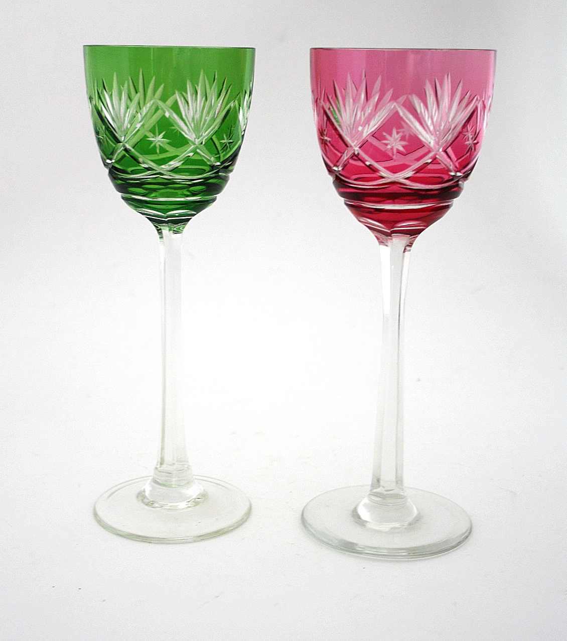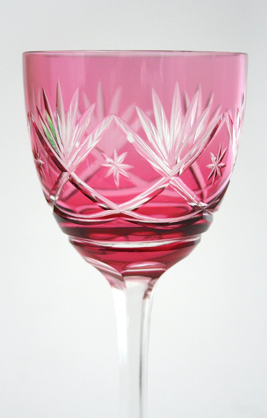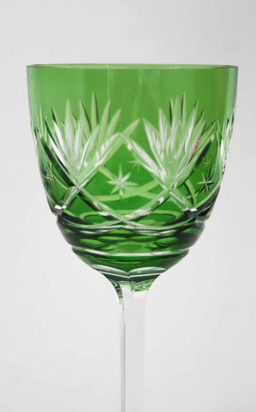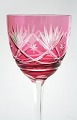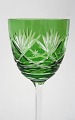Bøhmisk krystal, vinglas med slibninger på kumme og sleben stilk. Højde 20,50 cm. Pris: 250 kr. stk. Grøn. Lager: SOLGT Rød. Lager: SOLGT