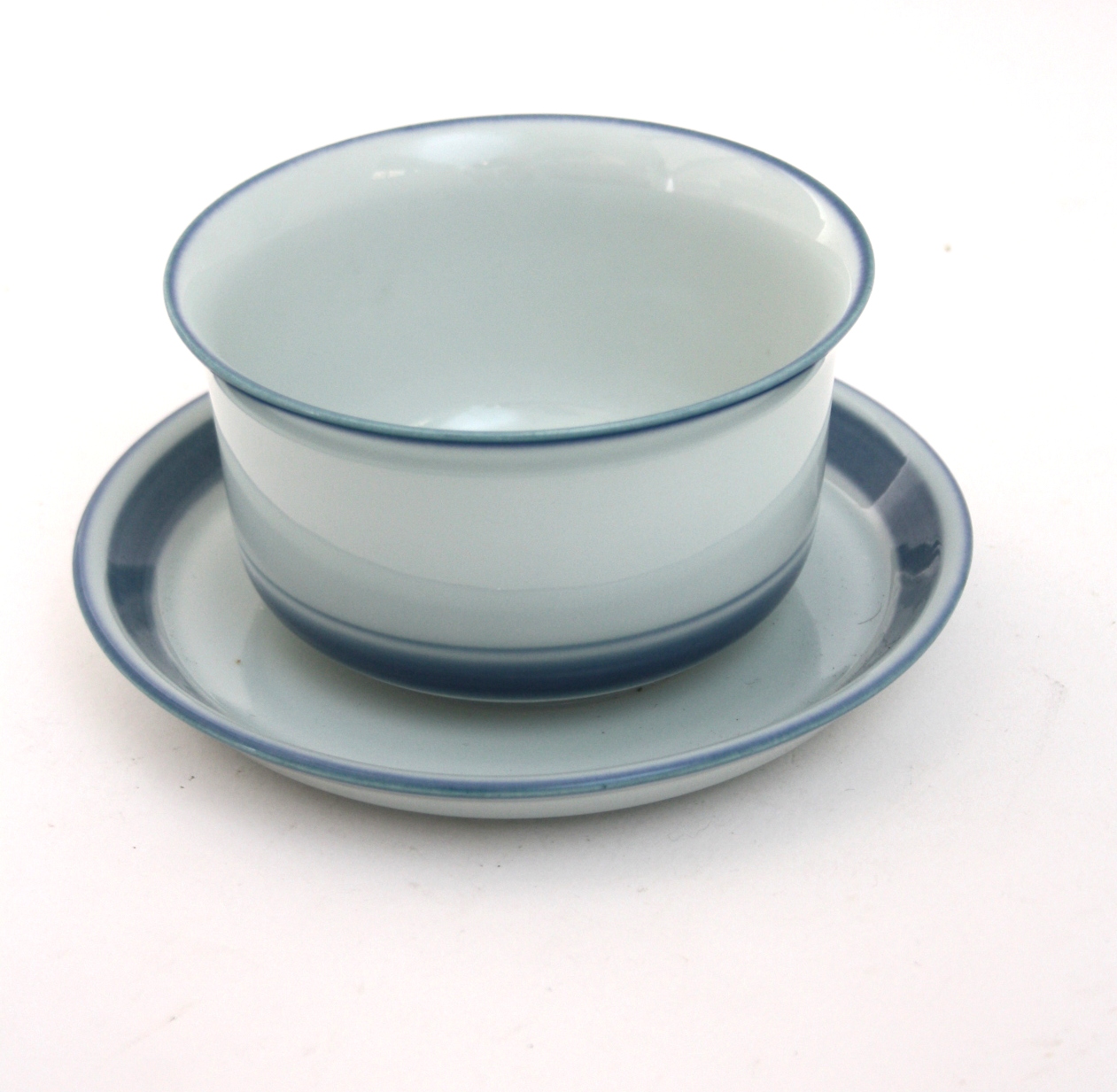 Desiree, Mistelten sovseskål med fast underfad. Højde 7,5 cm. Øverste diameter 12,5 cm. Nederste diameter 16 cm. Pris: SOLGT