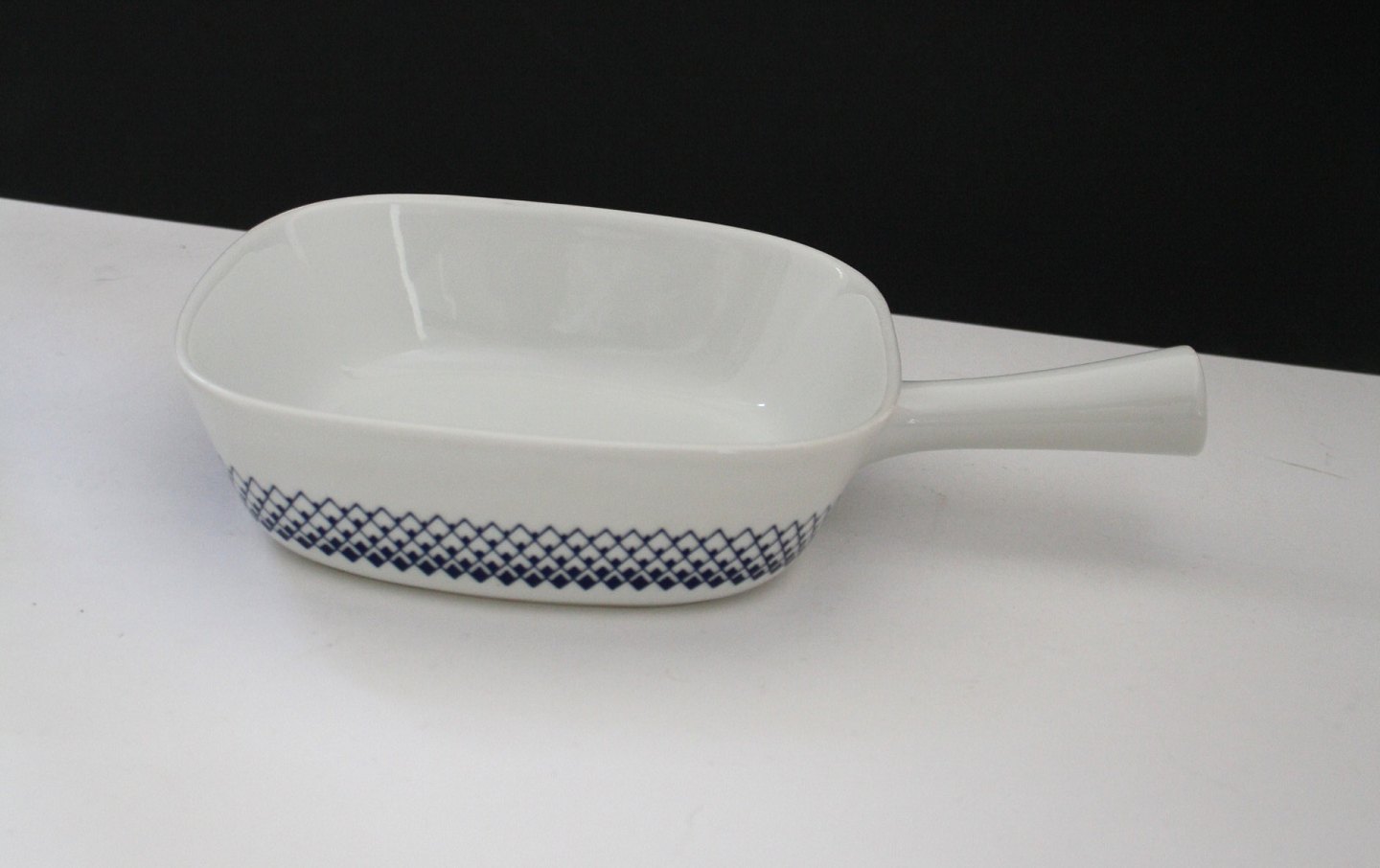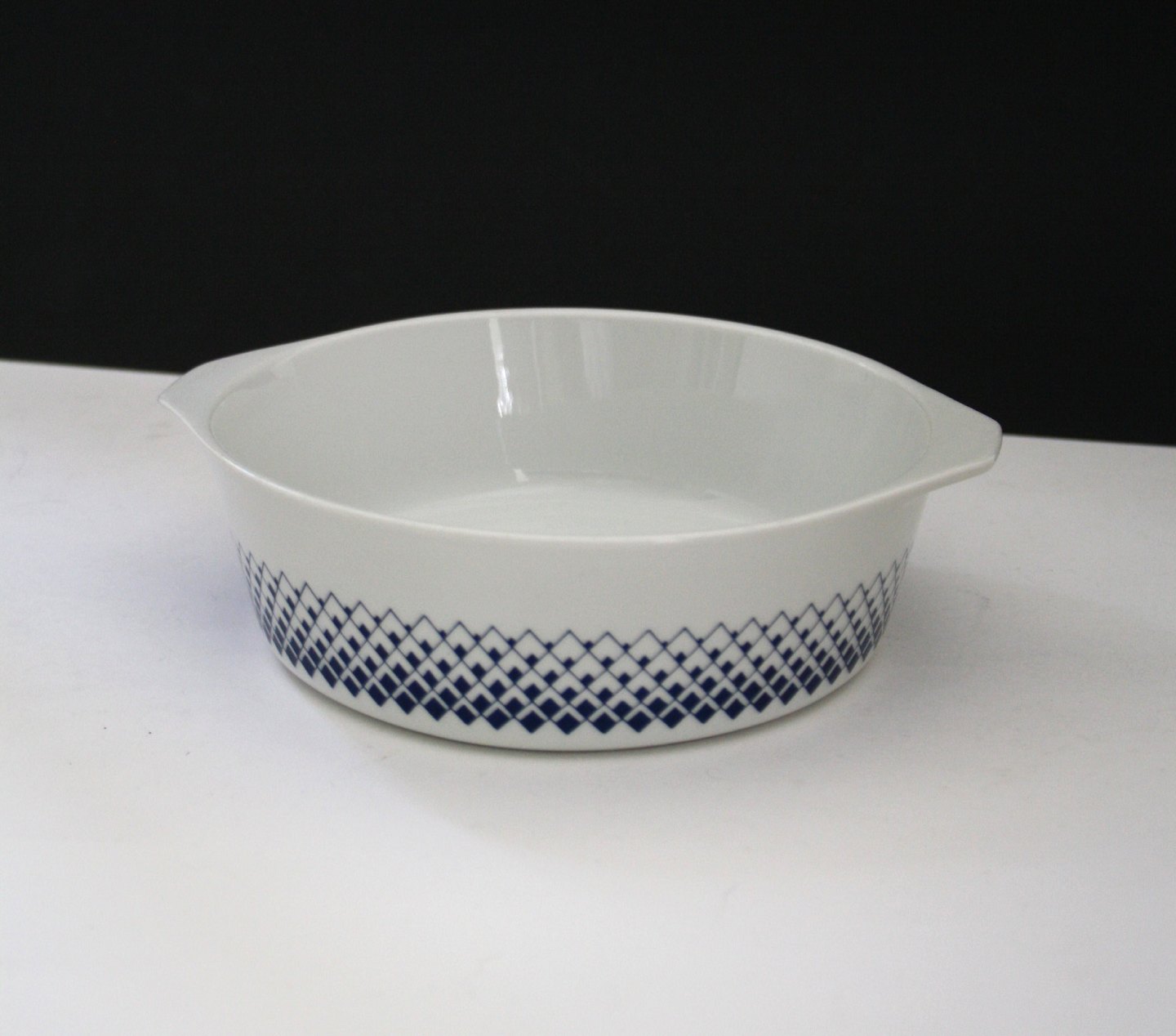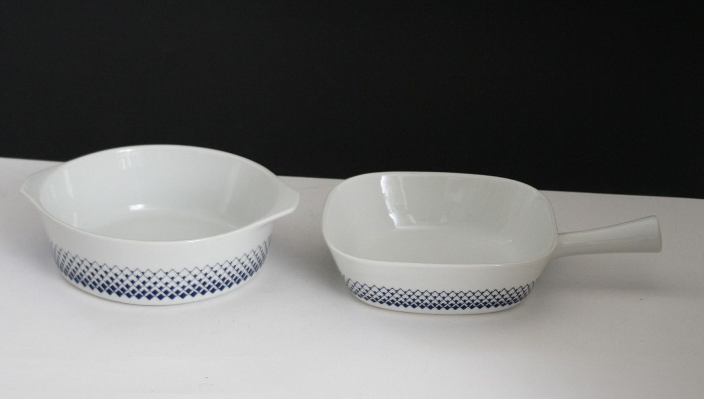 Lyngby porcelæn, Romber, Danild 66 Skål med ører. Højde 5,5 cm. Diameter 17 cm. Pris: 275 kr. Pande. Højde 5 cm. Længde 24 cm. Pris: 250 kr.