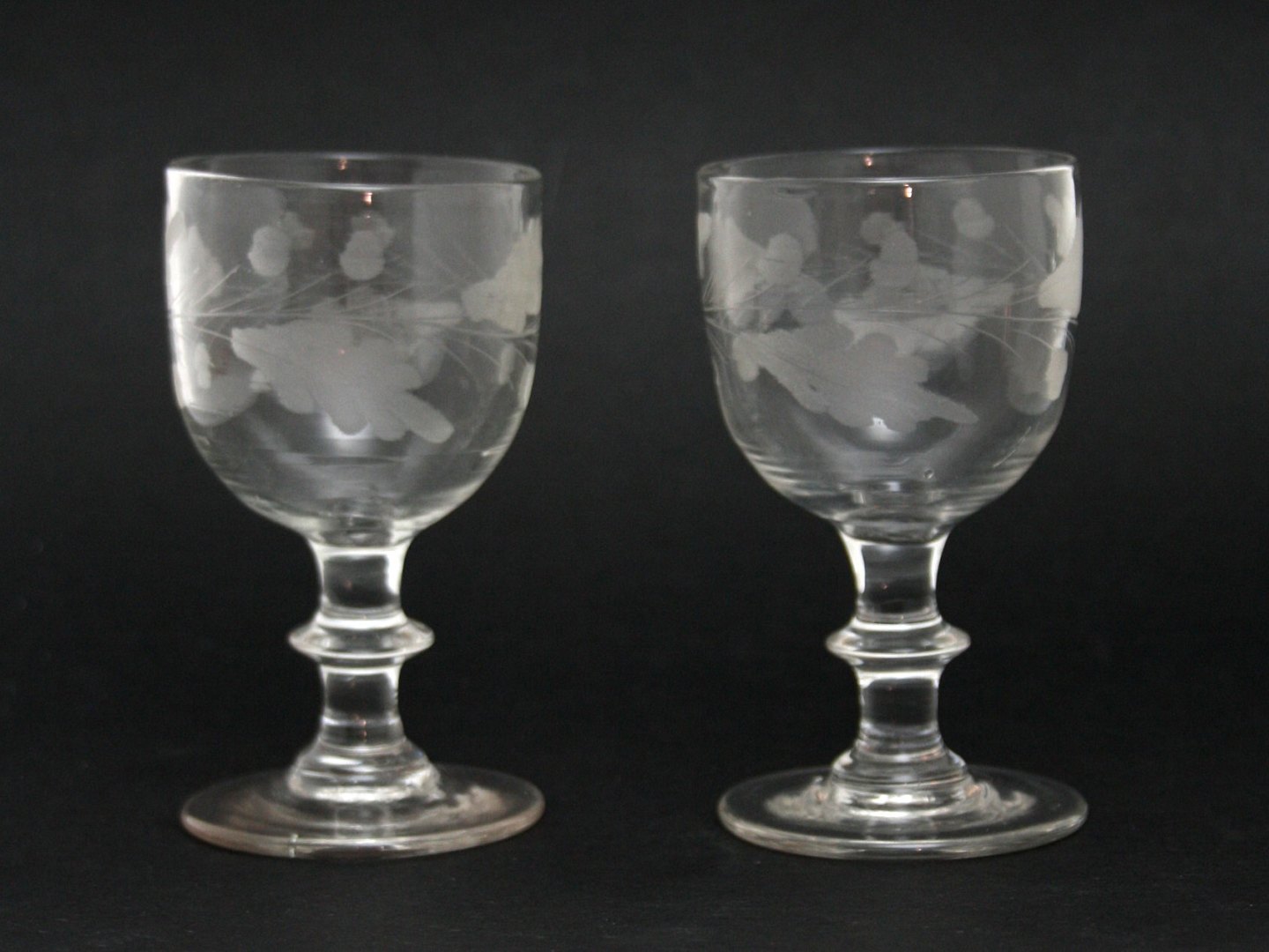 Holmegaard glasværk m.fl, Egeløvglas fra 1853 kataloget. 4 syvfligede fjerlappede blade, der peger med spids skiftevis opad og nedad. 2 ager placeret skiftevis over og under hvert blad. Knækket i bund. Højde 10,5 og 10,7 cm. Pæn og hel stand. Pris: SOLGT