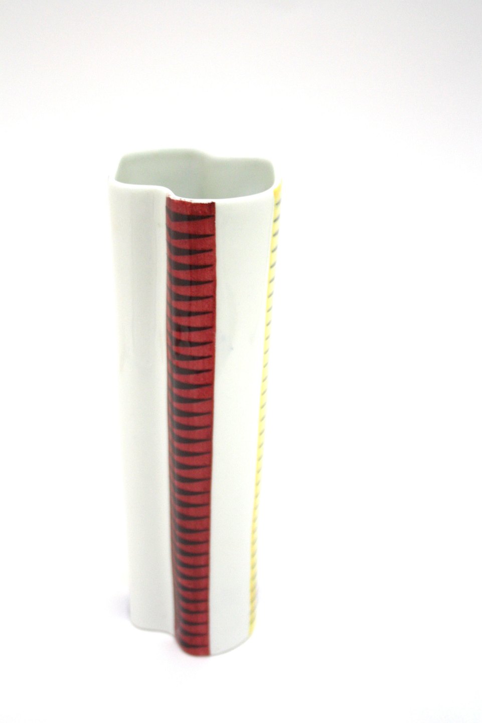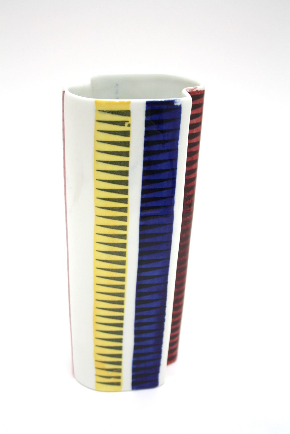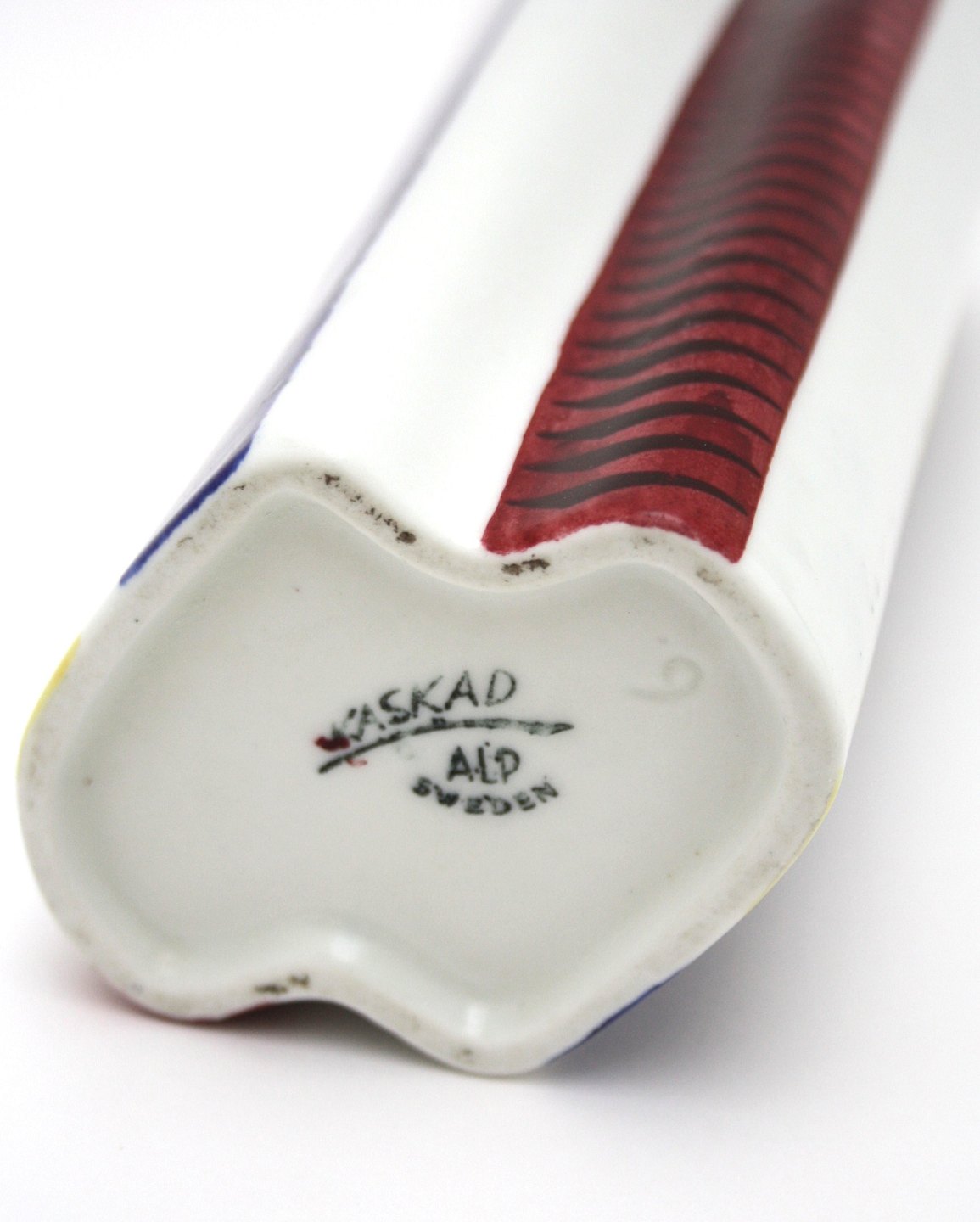 Linköbings porcelænsfabrik ALP overgår til Rørstrand i 1932, ALP stemplet bruges frem til 1943. Kaskad vase i hvid, gul, rød og blå. Højde 21 cm. Flot stand. Pris: SOLGT