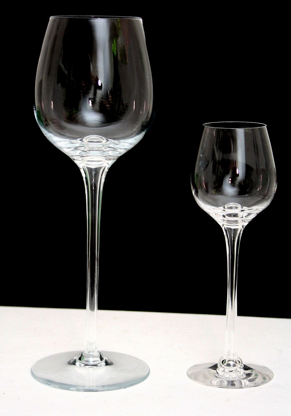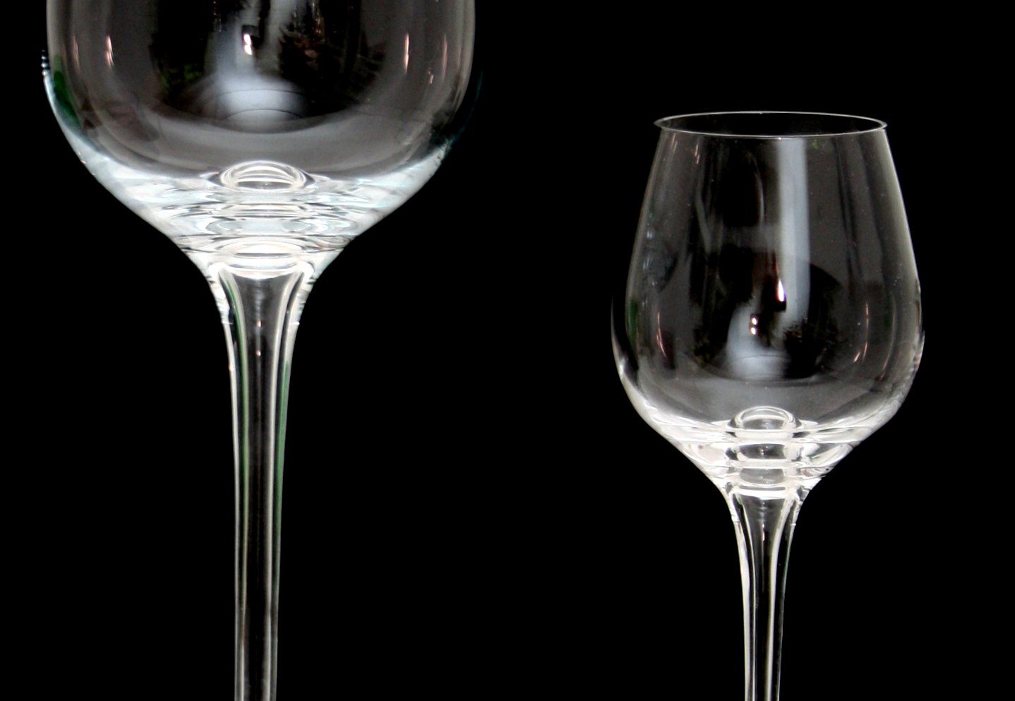 Et højt elegant glas med hul stilk, med en boble i bunden af glasset, et stykke glasmagerkunst.