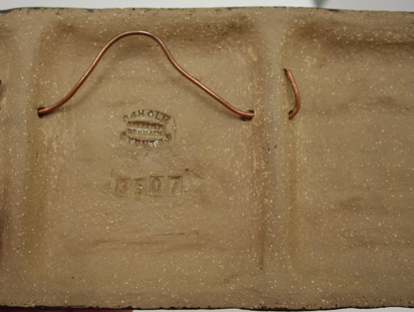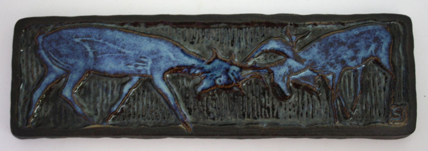 Søholm stentøj, Relief i blå og brun glasur med 2 kæmpende bukke designet af Simon Joseph. Formnr. 3507. 38 x 12 cm. Flot stand. Pris: 475 kr.