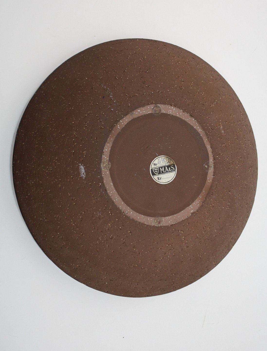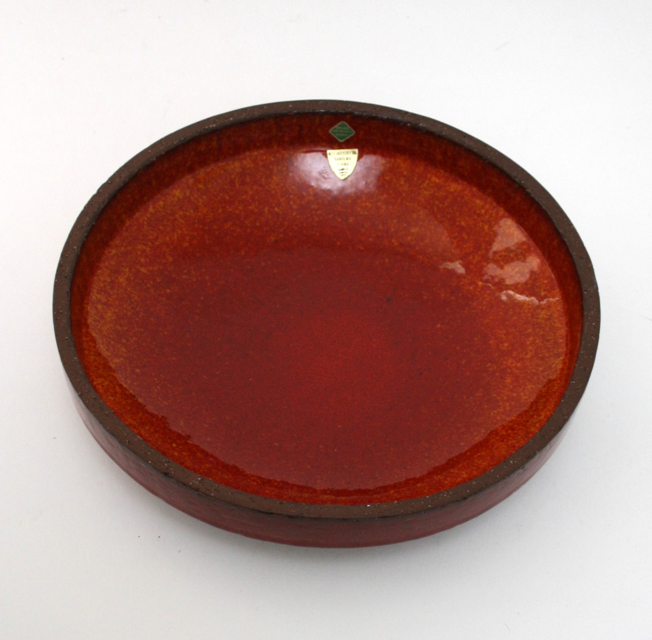 Michael Andersen, Rundt fad i uglaseret chamotteler med en utrolig flot changerende orange glasur. Formnr. 6141-2. Diameter 29 cm. Højde 7,5 cm. Flot stand. Pris: SOLGT