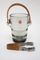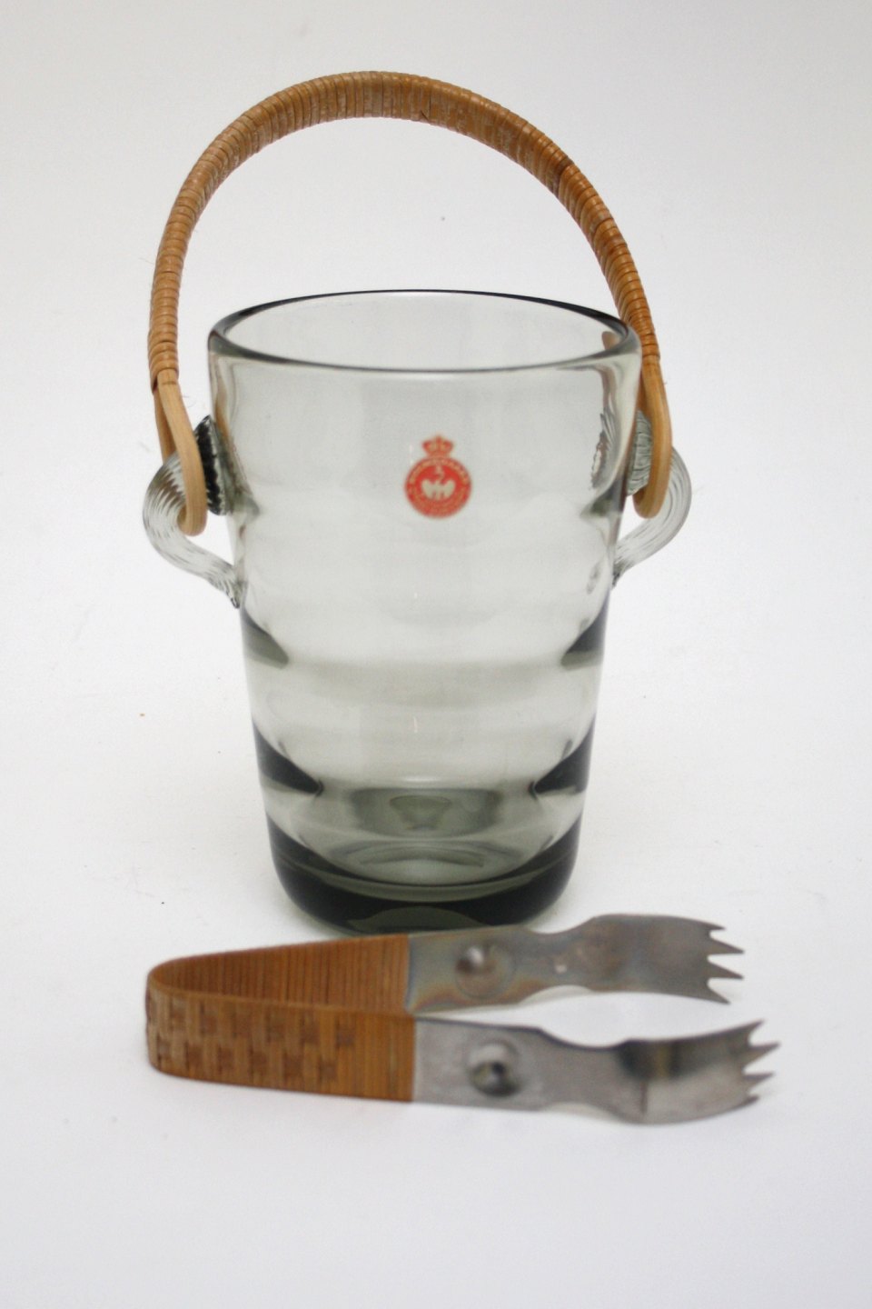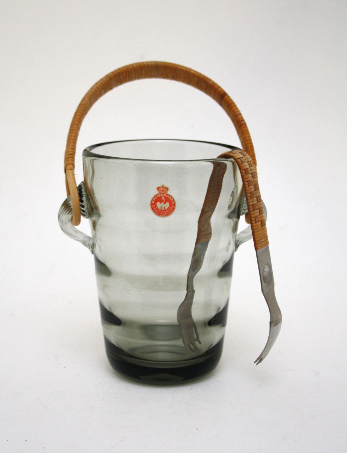 Holmegaard, Isspand i smoke serien med basthank og istang med bast, designet af Per Lütken i 1960. Højde 16 cm. Øverste diameter 10,5 cm. Pris: SOLGT