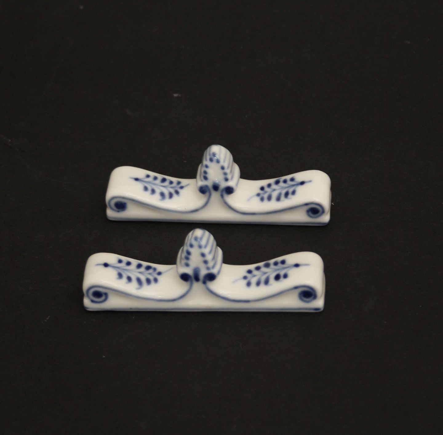 Royal Copenhagen, Musselmalet halvblonde Knivbukke. Formnr. 1/134. I. sortering. Længde 8 cm. Højde 3 cm. Flot stand fejlfri. Pris: SOLGT