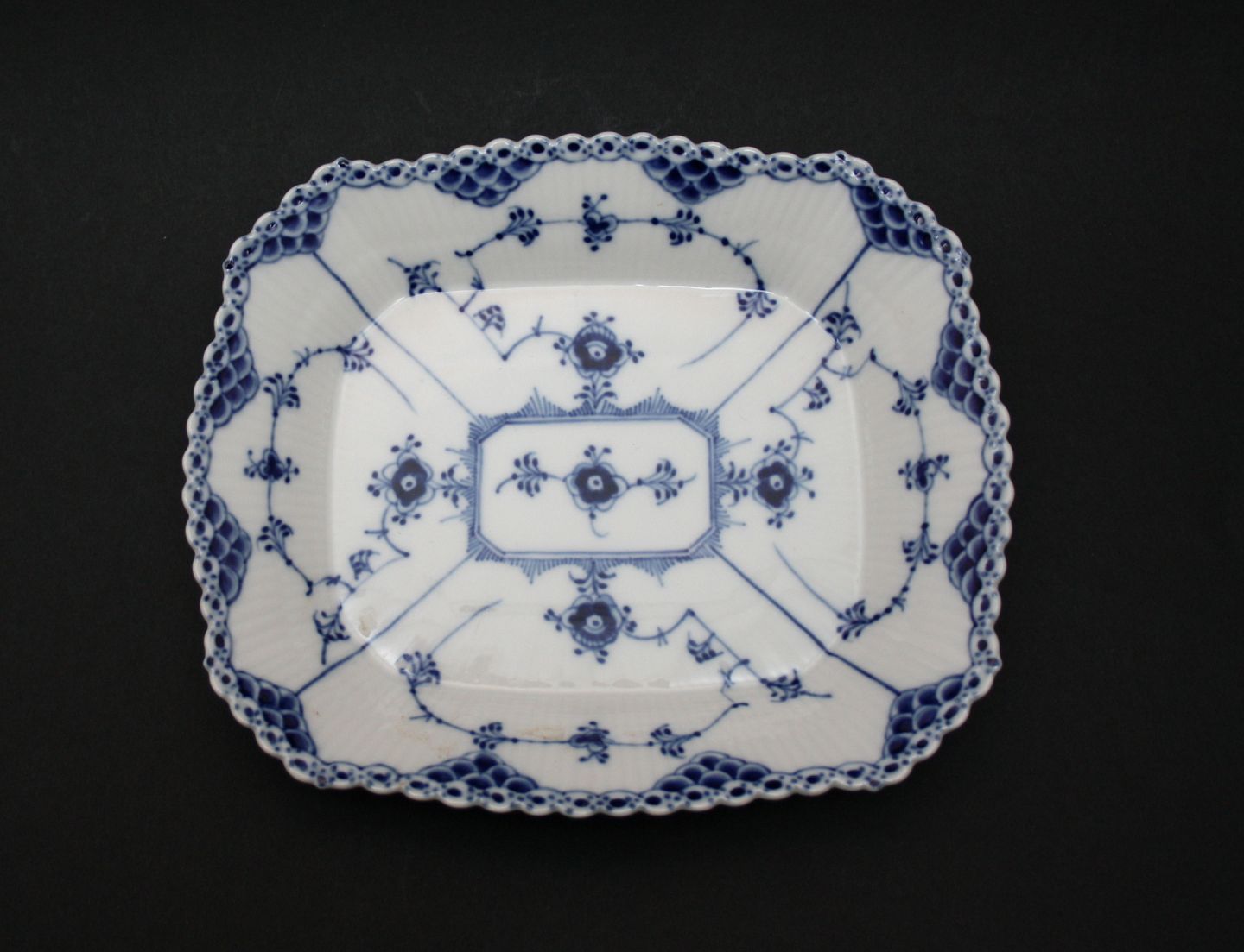 Royal Copenhagen, Musselmalet halvblonde Brødbakke. Formnr. 1/701. I. sortering. Længde 20,5 cm. Bredde 17 cm. Højde 3,5 cm. Flot stand fejlfri. Pris: SOLGT