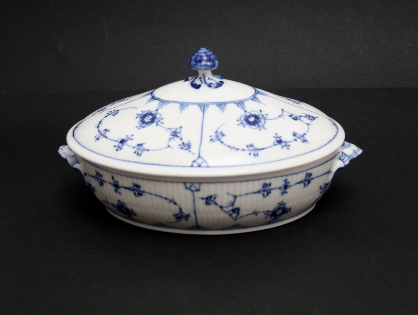 Royal Copenhagen, Musselmalet riflet Oval Terrin med låg. Formnr. 1/405. I. sortering. Længde med ører 23 cm. Bredde 15,5 cm. Højde med låg 12 cm. Flot stand fejlfri. Pris: SOLGT