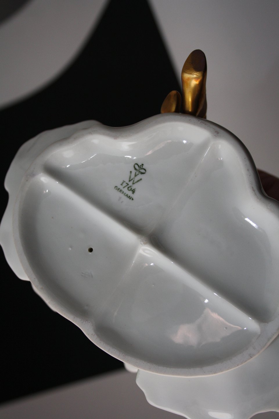 Wallendorf, Germany, Ballerina der sminker sig. Mærket W 1764 Germany. Kjole er glasseret, krop og hoved uglasseret. Påsatte blomster på kjolen. Højde 20,5 cm. Flot stand. Pris: SOLGT