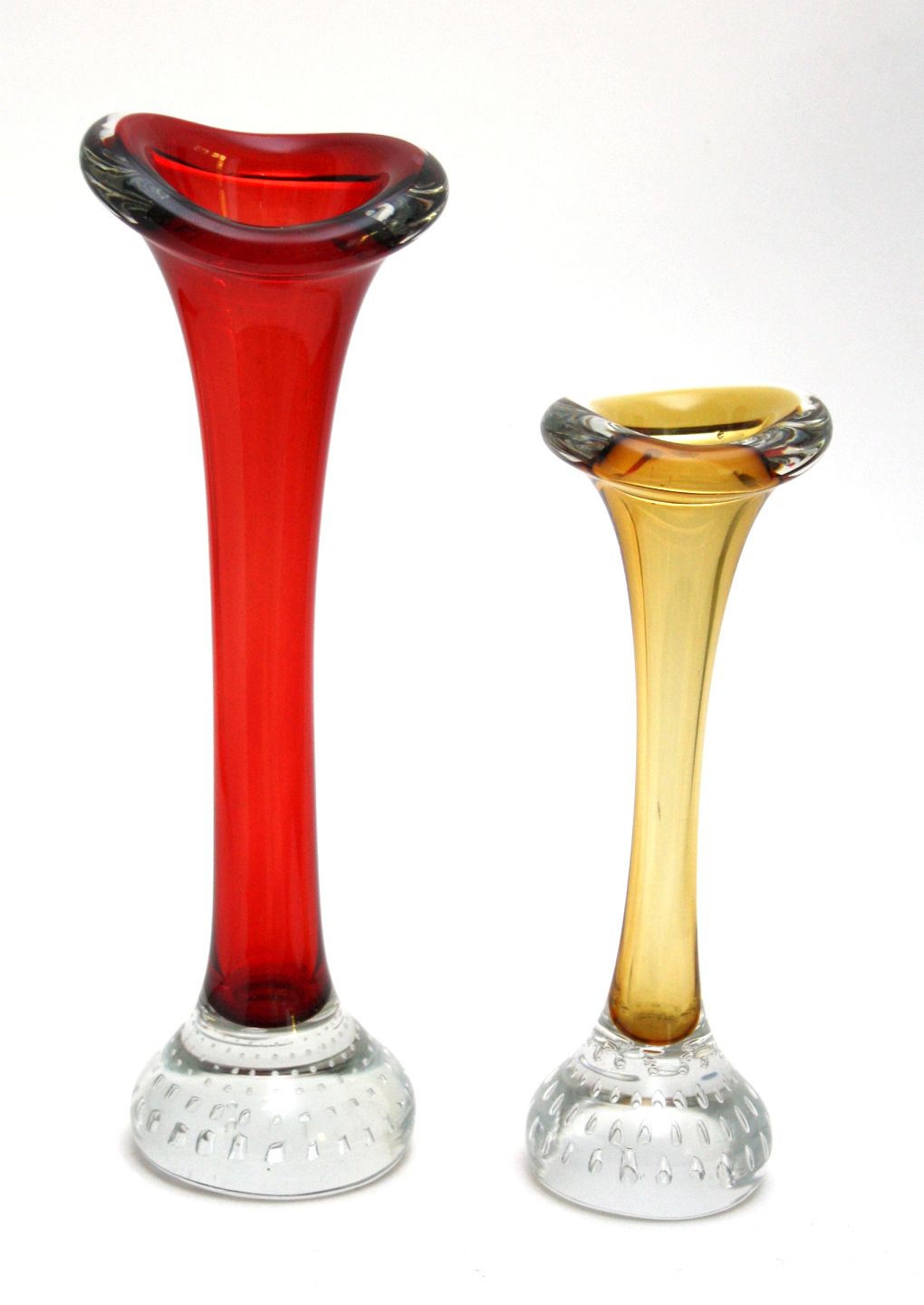Knoglevaser Rød med bobler i fod. Højde 25,3 cm. Pris: SOLGT Ravfarvet med bobler i fod. Lidt kalk indvendig. Højde 19,3 cm. Pris: SOLGT