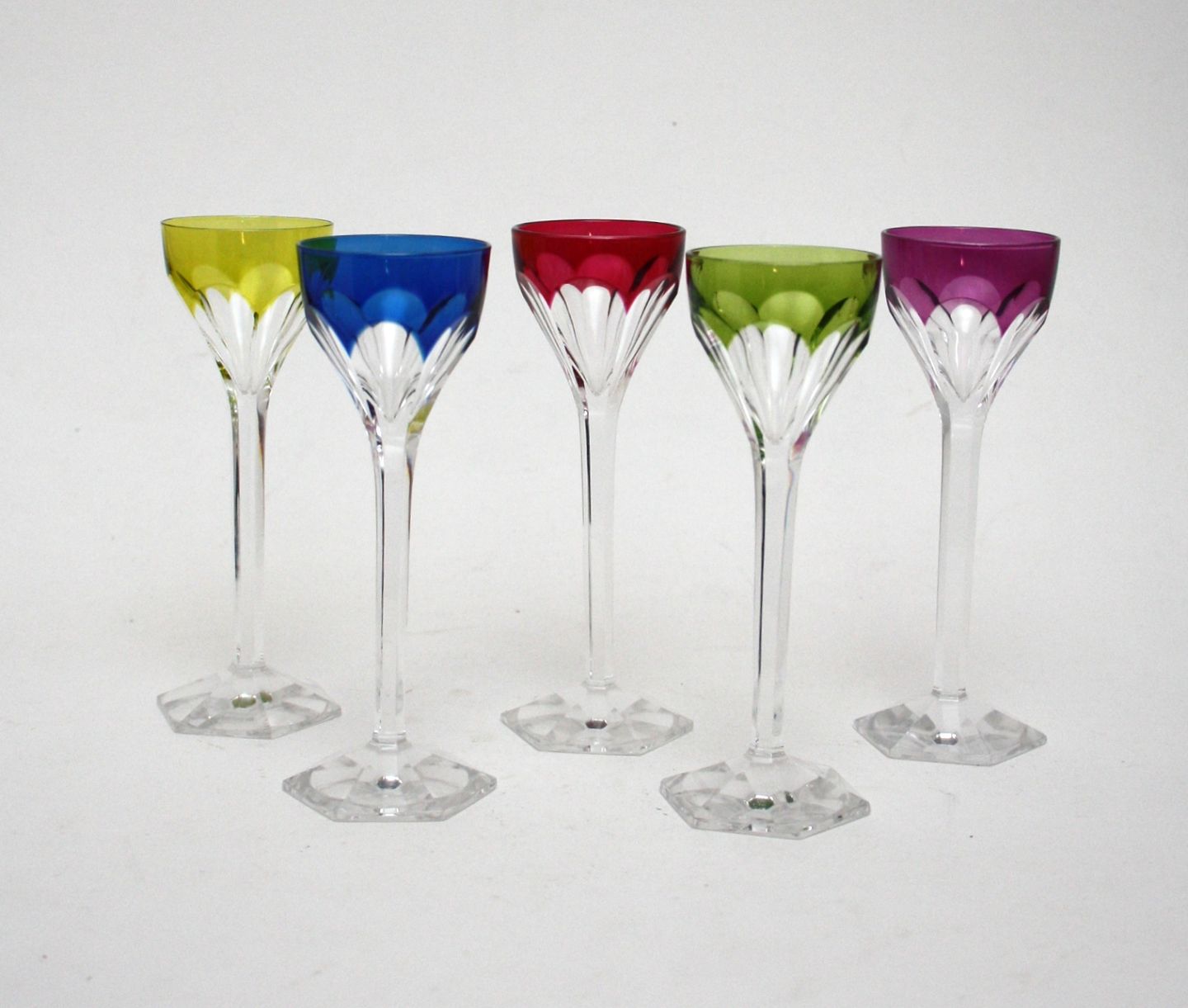 Val St Lambert, Belgien Legagneux. Krystal glas med sleben stilk og 6 kantet fod. Neongrøn, Blå, Rød, Lysegrøn og Lilla. Højde 13 cm. Pris: SOLGT