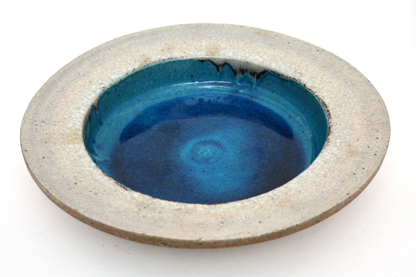 Kähler, stort rundt fad med blå glasur i bund og lys glasur på kant. Signeret HAK Nils. Diameter 31 cm. Højde 5,5 cm. God stand mindre afslag på kant, derfor nedsat. Der er sat beskyttelse kork propper i bunden. Pris: SOLGT