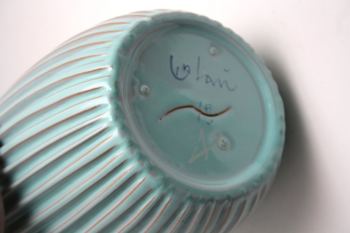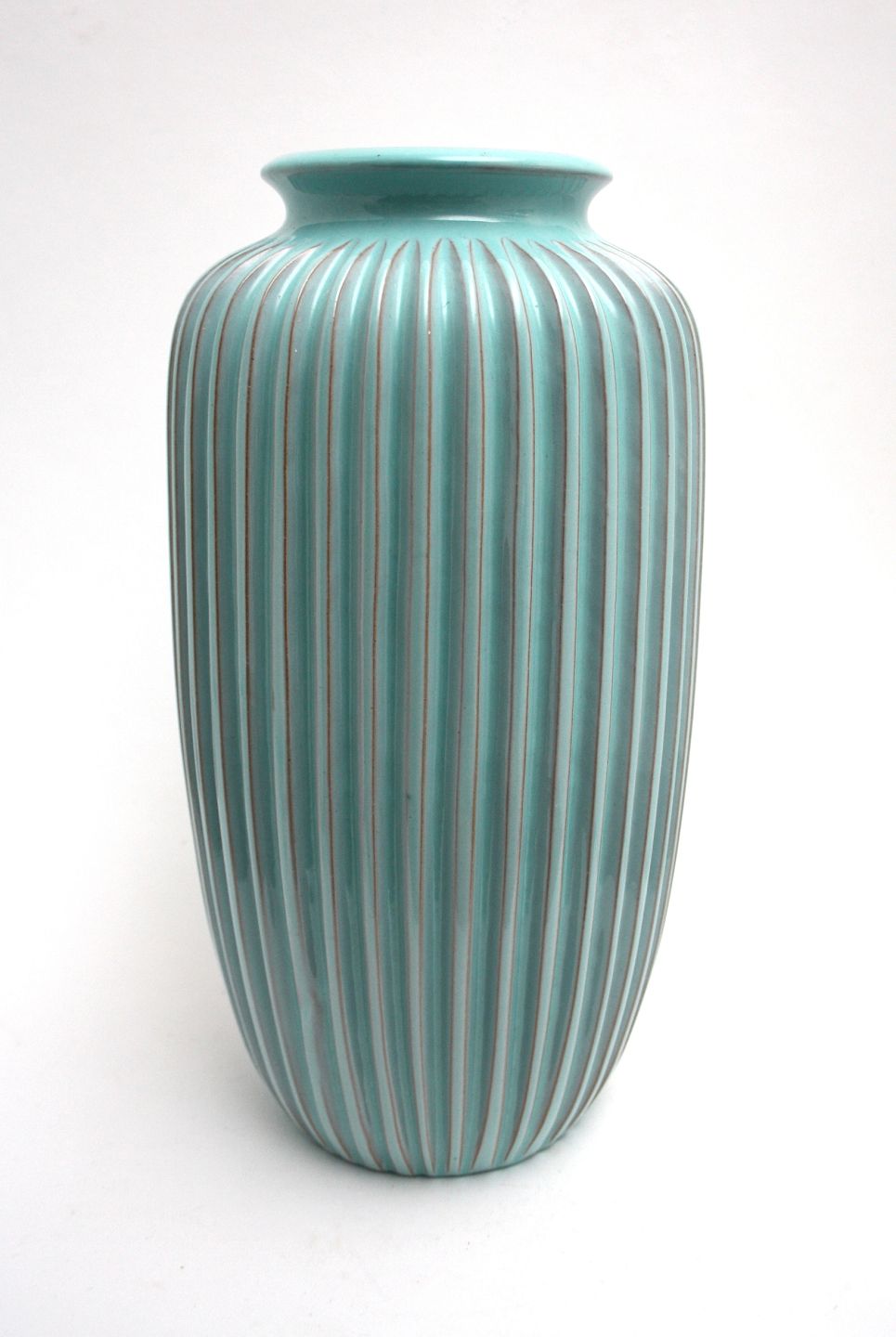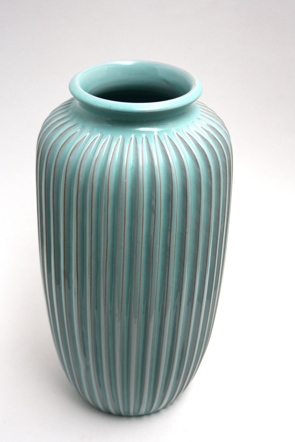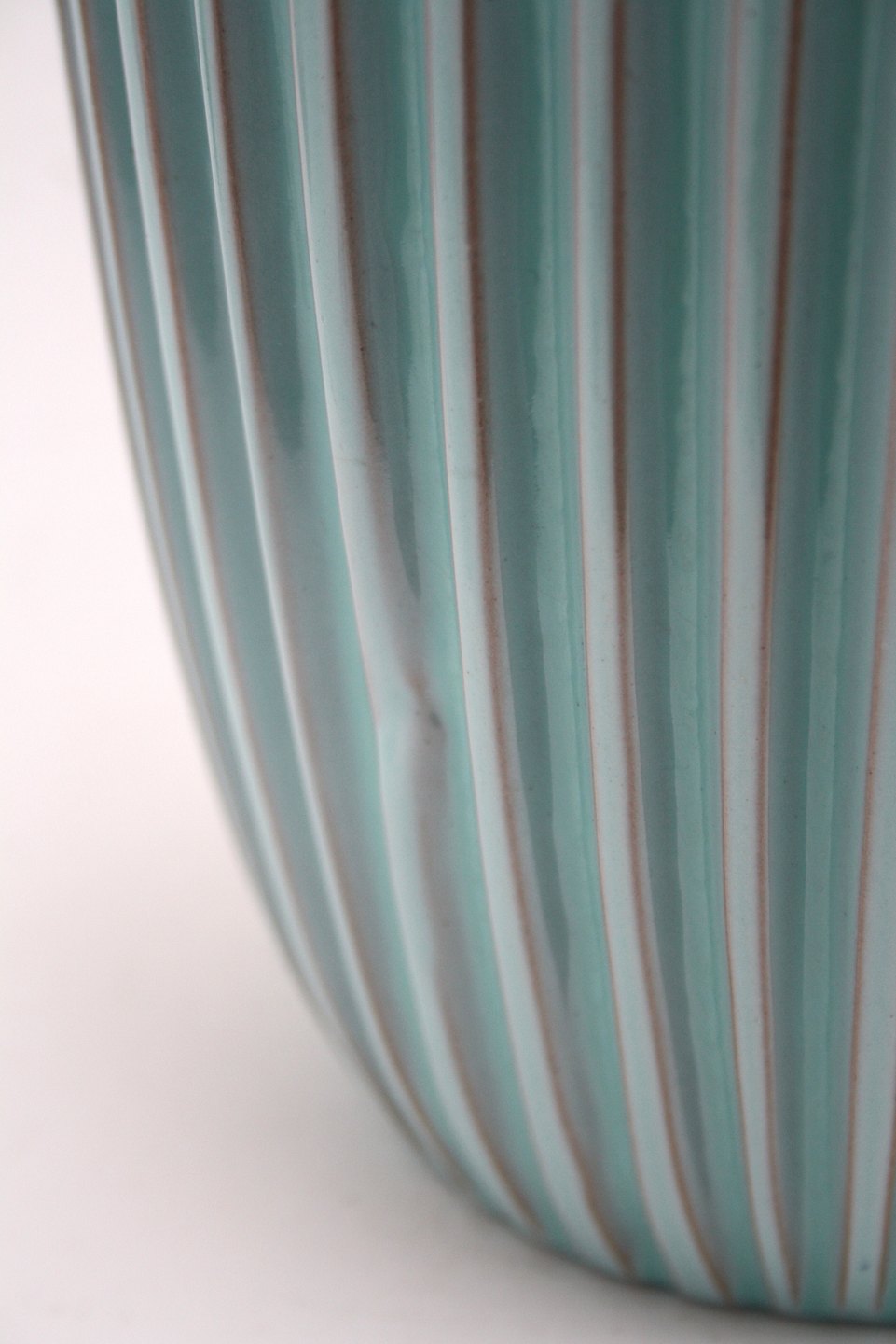 Eslau, rillet gulvvase i blank turkis glasur. Højde 38 cm. Midterste diameter 19 cm. Signeret Eslau. II sortering på grund af bue i leret i en af rillerne, se ekstra foto. Perfekt stand ingen skår og afslag. Pris: SOLGT