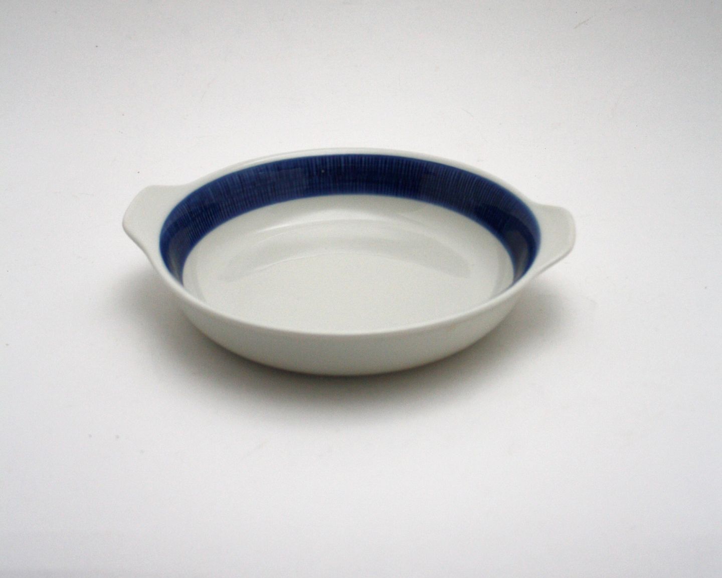 Rørstrand, Blå Koka designet af Hertha Bengtson i 1956. Skål med ører. Formnr. 60. Højde 3 cm. Diameter 17,5 cm. Længde med ører 20 cm. Flot stand. Pris: SOLGT