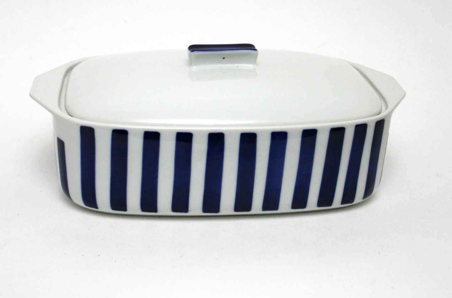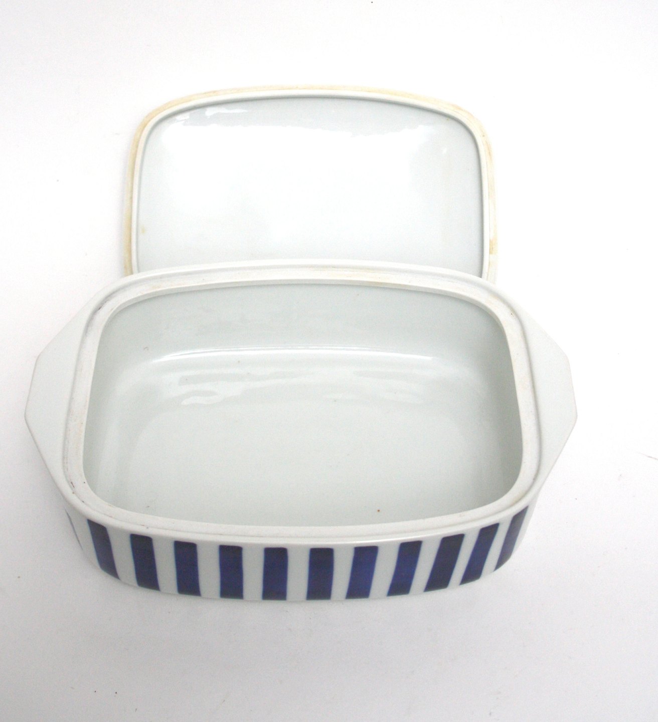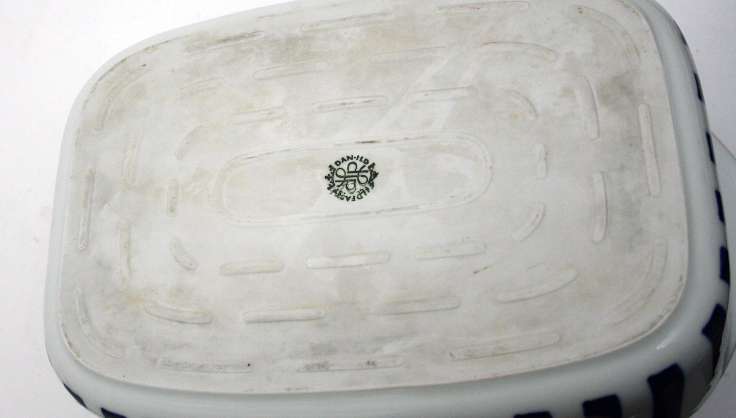 Lyngby Dan-ild med glasurfarver, stribet. Design Axel Brüel i 1958. Ildfast fad med låg. Længde 29 cm. Højde 10 cm. Fin stand. Pris: SOLGT