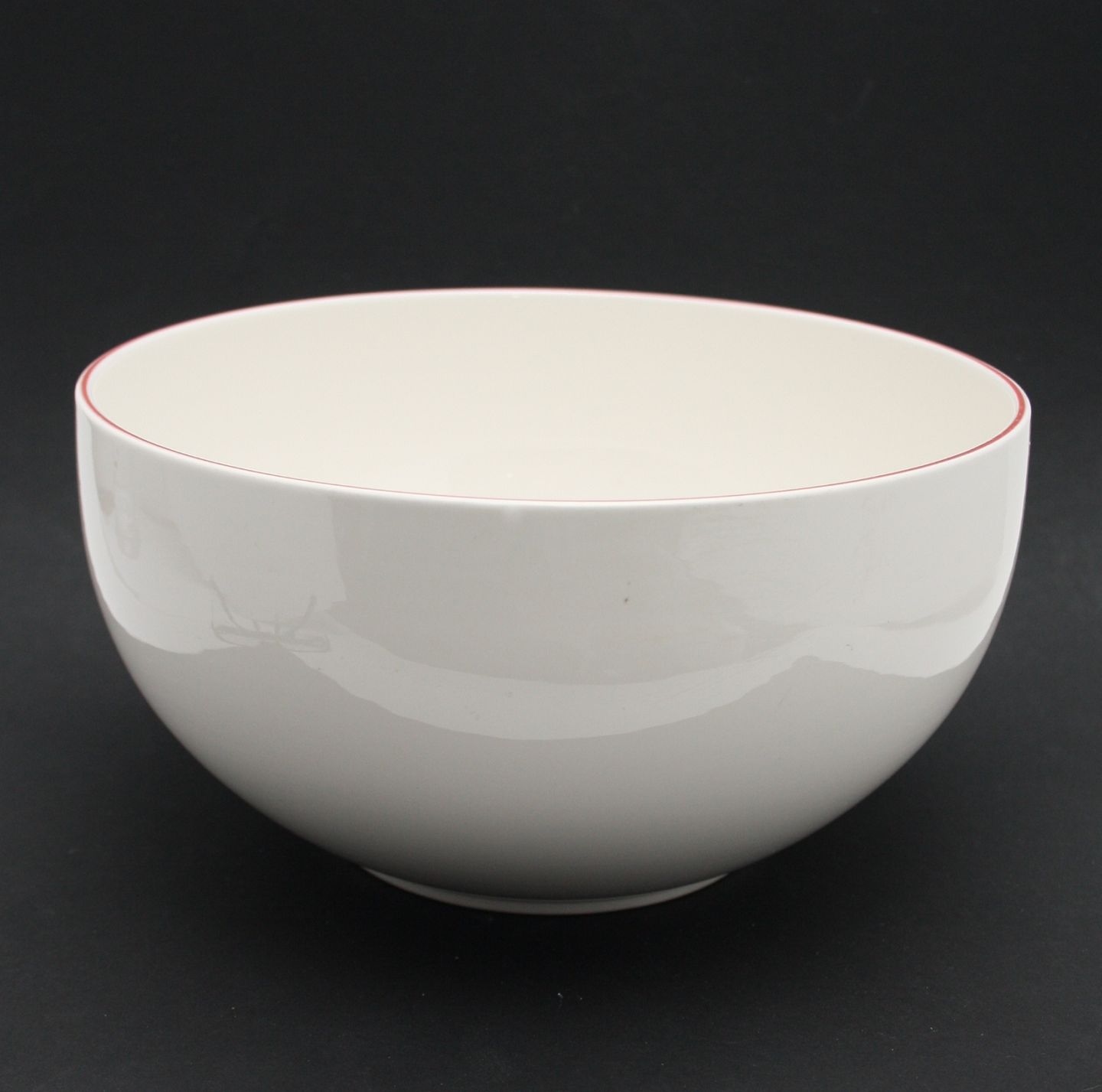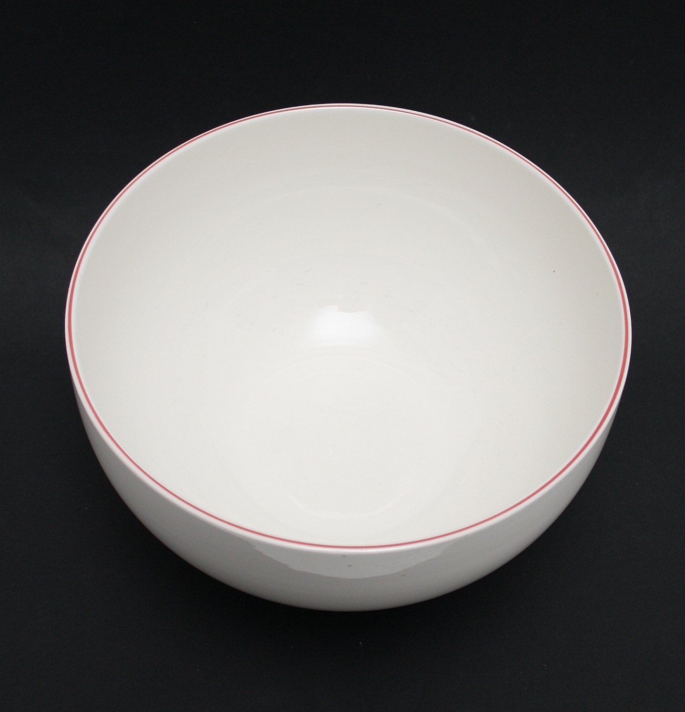 Royal Copenhagen, Rødtop hvid fajance med rød kant designet af Grethe Meyer i 1980'erne. Stor skål. Formnr. 5090. Højde 13 cm. Diameter 25 cm. II sortering. Lettere brugsslid indvendig i form af små sorte ridser. Pris: SOLGT