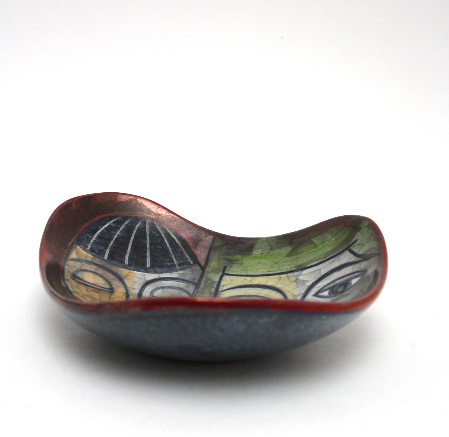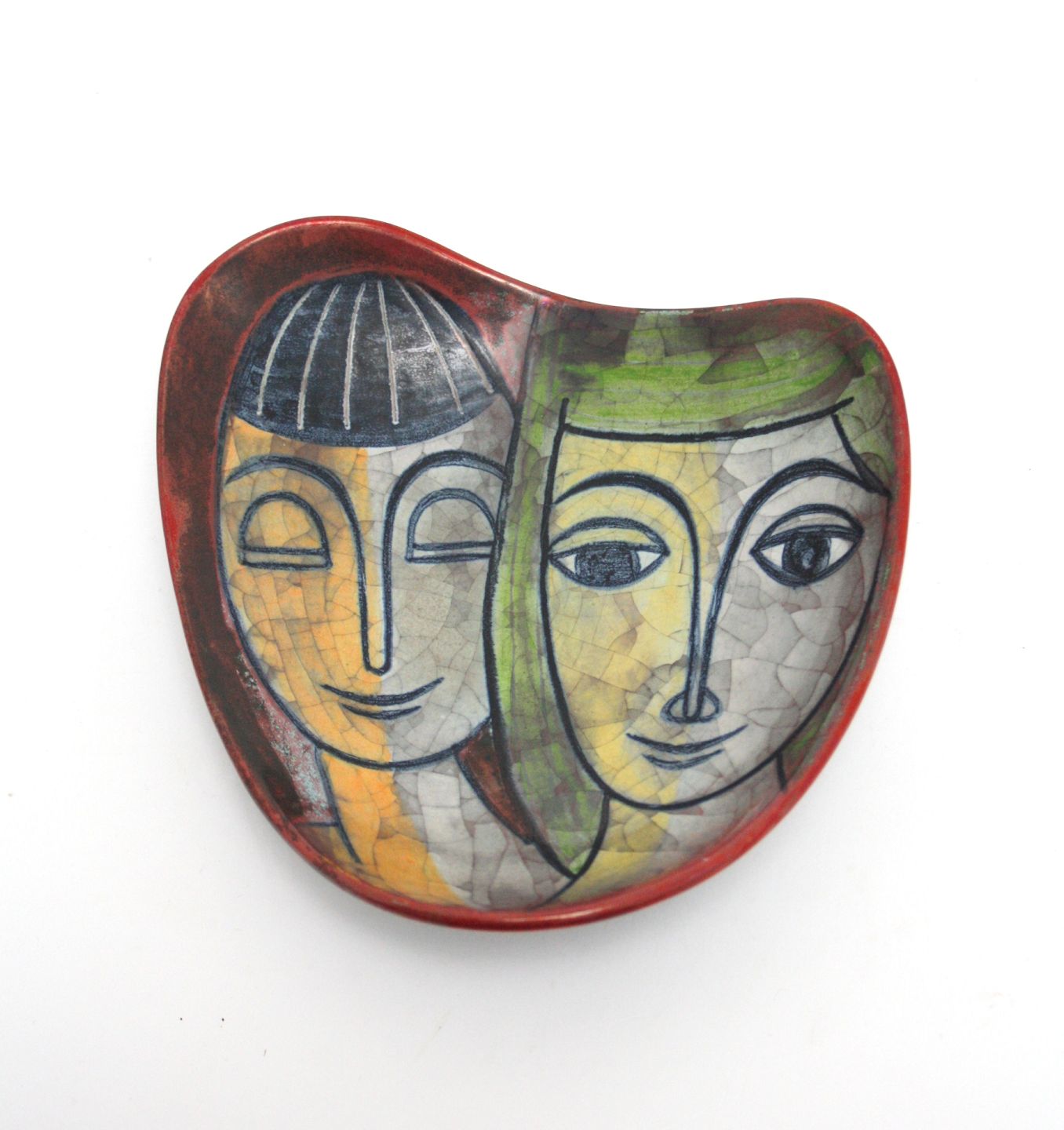 Michael Andersen, Bornholm, Hjerteformet skål med 2 kvindeansigter i krakeléglasur. Formnr. 5653. Længde 21 cm. Bredde 19,5 cm. Højde 5,5 cm. Perfekt stand. Pris: SOLGT