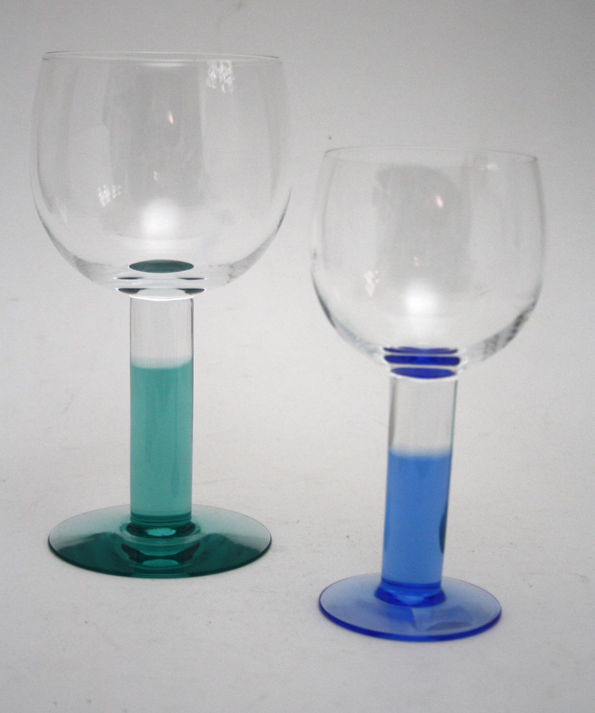 Iittala, Finland, Mondo designet af Kerttu Nurminen i 1988. I produktion indtil 2003. Rødvin med grøn farve i stilk. Højde 19,5 cm. Diameter 9 cm. Pris: SOLGT Hvidvin med blå farve i stilk. Højde 16,8 cm. Diameter 7,5 cm. Pris: SOLGT