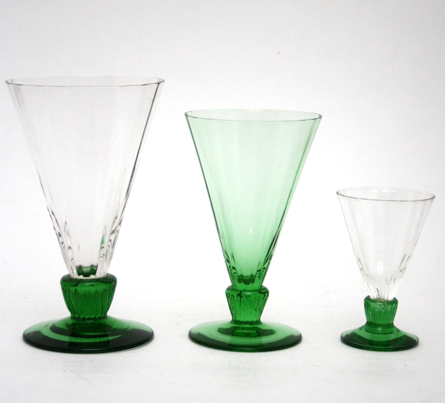 Holmegaard Glasværk, Tårnholm glas med optiske striber og spids kumme med grøn eller sort fod. Designet af Jacob E. Bang i 1932, i produktion fra 1942-1950.
