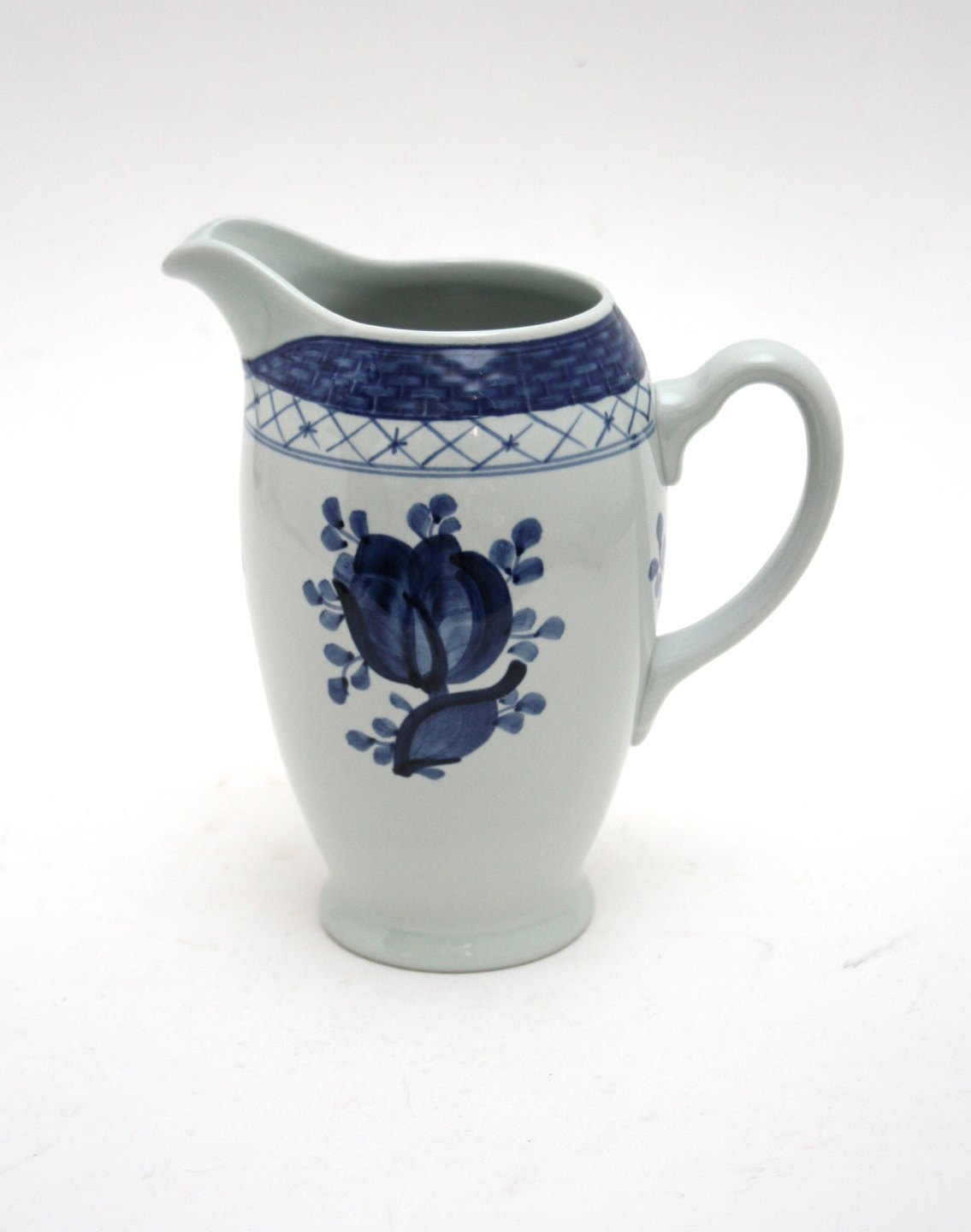 Aluminia, Tranquebar lyseblå fajance med mørkeblå tulipan og flettet bort designet af Christian Joachim. Produceret fra 1914 til 1969, hvor det overgik til Royal Copenhagen. Håndmalet.