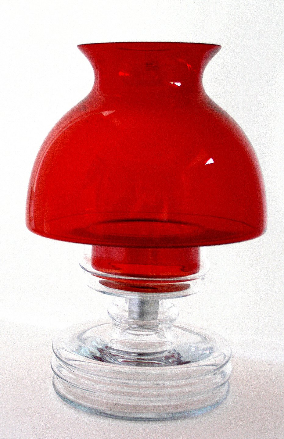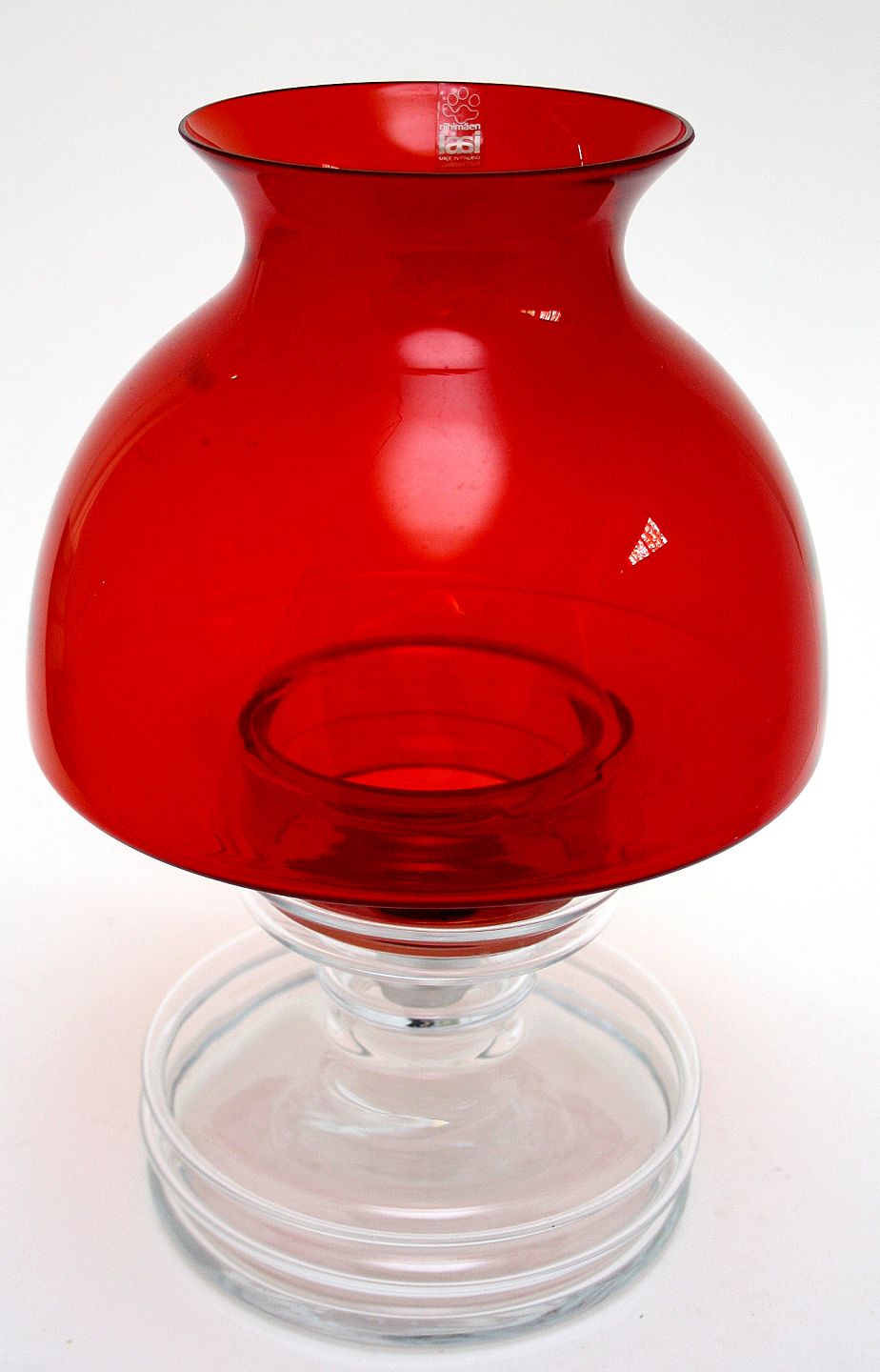 Apollo Lyslygte med flot mundblæst rubinrød kuppel og klar glas underdel. Designet i 1969 af Nanny Still for Riihimäen Lasi. Finland. Produceret fra 1970-76. Højde 26,5 cm. Pris: SOLGT