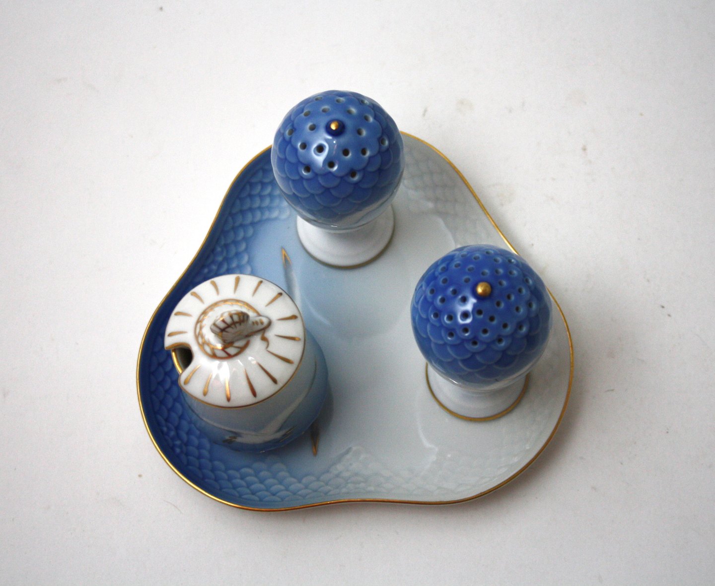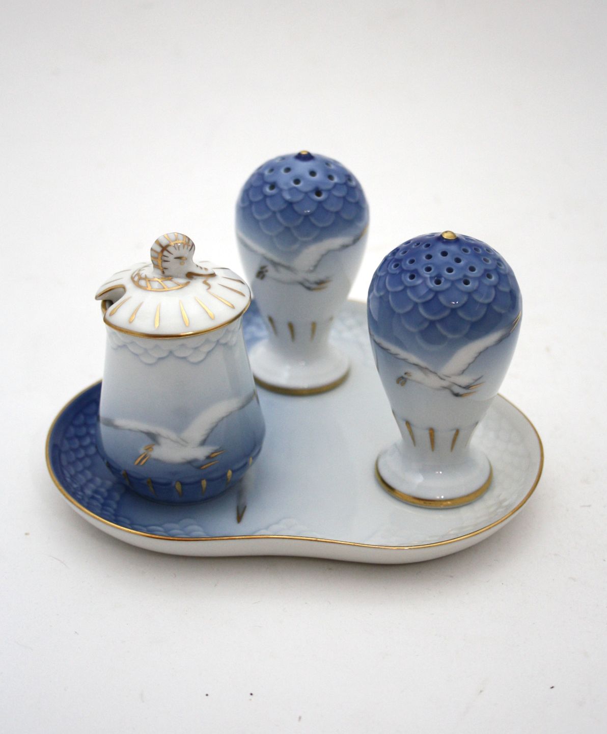 Bing & Grøndahl, Måge med guld. Plat de menage bestående af salt, peber, sennep med låg formnr. 52c og bakke formnr. 52D. II sortering. Pris: SOLGT